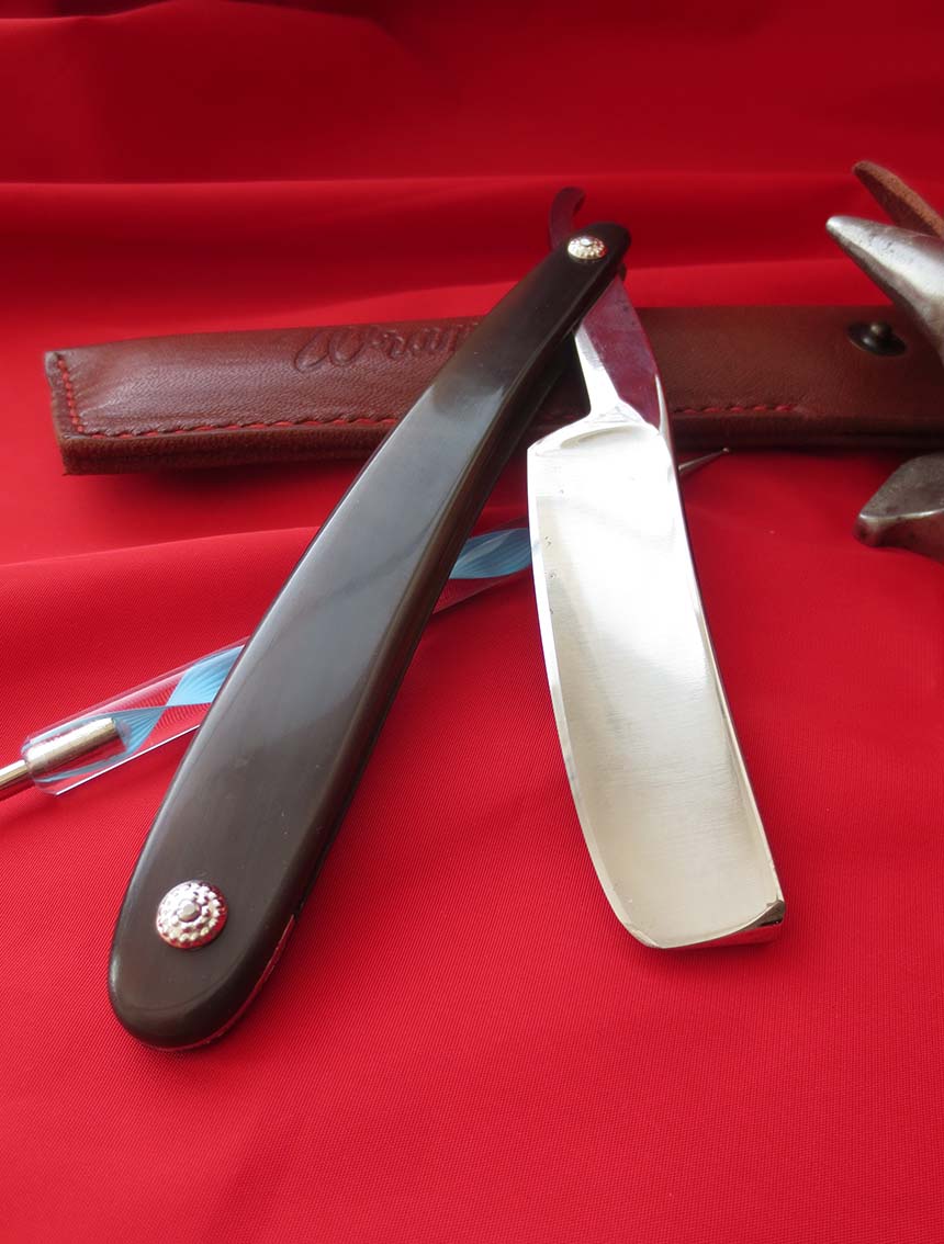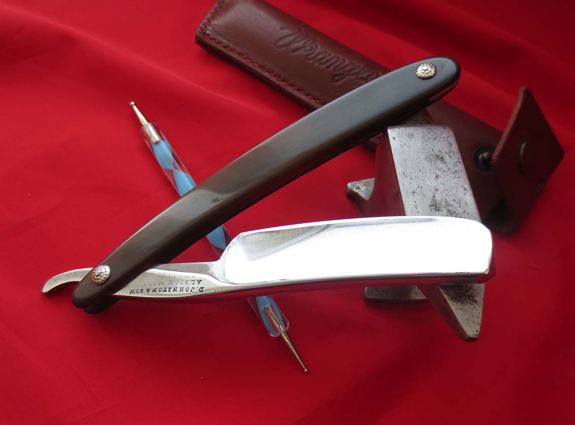 Английская опасная бритва D.Johnston & Son Albion Works Sheffield. Кованая вручную высококачественная ширина клинка - 13/16 дюйма (21мм), новая ручка - рог американского бизона, клинышек - олово, заклёпки - нейзильбер. Инструмент заточен только на натуральных природных камнях и даёт приятное мягкое бритьё. После заточки и теста бритва была продезинфицирована, направлена на чистом кожаном ремне и не использовалась. Очень солидный и увесистый экземпляр не только для человека решившего бриться правильно, но и для желающего обрести весьма статусную вещь. Чехол из натуральной кожи ручной работы для хранения бритвы прилагается. Также есть в наличии всегда ремни для правки бритв, при покупке бритвы и ремня пересылка по РФ за мой счёт. Начинающим подскажу и покажу, как пользоваться и ухаживать за инструментом. Цена "Джонстона" - 15200 рублей. Бесит, когда приходится пользоваться бритвой моложе себя...