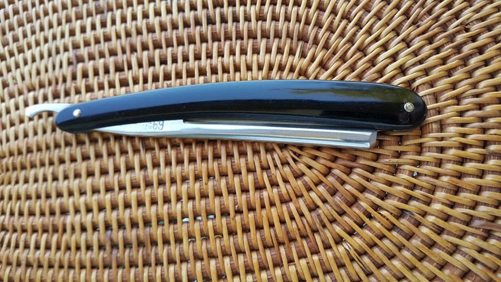 Re: Продаётся от S&T21. Нечастый гость - G.Johnson, под восстановление. Бритва из эпохи становления hollow ground. Ширина 20мм, длина рабочей кромки 65мм, обух около 6мм. Есть каверны, сточенность минимальная, в районе рабочей кромки коррозии и повреждений нет. Клинок производит впечатление слегка укороченной/дорожной версии, по крайней мере на фоне ручки, которая стандартного размера 145мм. Ручка из рога, в очень хорошем состоянии, без трещин, ровная. Клинышек из олова.