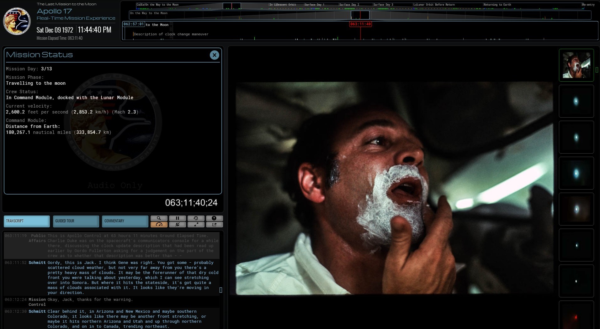 Re: Интересные фото с бритвойИнтересный сайт сделан NASA к 45-летию полета на Луну (Apollo 17), всё воспроизведено в видео/аудио/фото формате в реальном времени. Очень впечатляет детальностью.