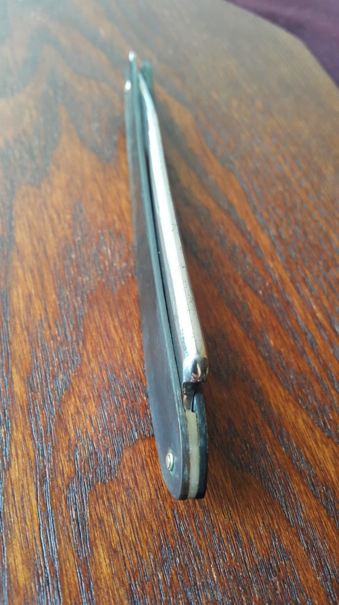 Продаётся от S&T30. Старый и заслуженный французский клин Fontenille, из XIX века. Ширина 20мм, следы ковки на эрле. Родная ручка из рога, ровная, без выгрызов. Бритва была разобрана, почищена и собрана. Установлены внутренние шайбы для плавности хода клинка. Бритва заточена без изоленты.