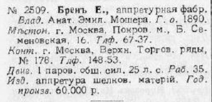 (1) - Езиоранский, Леон Карлович; Фабрично-заводские предприятия Российской империи (исключая Финляндию) Изд. 2-е. - Петроград : издали инж. путей сообщ. Д. П. Кандауров и сын, 1914 год (2) - Список фабрик и заводов г. Москвы и Московской губернии : составлен фабричными инспекторами Московской губернии по данным 1916 года, Отд. пром-сти М-ва торговли и пром-сти. - М. : Т-во тип. А. И. Мамонтова, 1916. (3) - Экспорт, импорт и концессии Союза ССР под ред. А. Трояновского, Л. Юровского и М. Кауфмана. - Москва : издание Гос. конторы объявлений "Двигатель", 1926. (4) - Вся Москва. Адресная и справочная книга на 1930 год с приложением нового плана г. Москвы. : 6-й год издания. - [М.], 1930 (5) - В. В. Булатов, О. А. Гоманенко, ГЛАВНЫЕ ФАКТОРЫ СВЕРТЫВАНИЯ КОНЦЕССИОННОЙ ПРАКТИКИ В СССР электронный журнал по историческим наукам и археологии. 2016. № 1. С. 32-42. (6) - Иностранные концессии в СССР (1920–1930-е гг.): документы и материалы / под ред. М. М. Загорулько. – М., 2005 (7) - Вся Москва. Адресная и справочная книга на на 1931 год: 7-й год издания [Московского Совета] : С приложением нового плана г. Москвы. - [М.], 1931 (8) - http://lawru.info/dok/1932/10/09/n1197415.htm Постановление СНК РСФСР от 09.10.1932 "Об организации управления легкой промышленности РСФСР" http://lawru.info/dok/1932/03/10/n1197799.htm Постановление ВЦИК, СНК РСФСР от 10.03.1932 "О реорганизации управления республиканской и местной промышленности" __________________________________________________