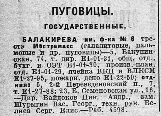 Улица Б. Семеновская в начале 20 века была по большей части заводской. Это связано с близостью транспортных путей: реки Яуза, железнодорожной ветки (Казанское направление) и разумном удалении от центра города, торговых площадок. Весной 1914 года, после проливных дождей, на этой улице случилось наводнение. 1 апреля 1914 года газета «Русское слово» пишет (я немного сократил): "Вода затопила дворы. Проникла в подвалы. Особенно много воды было во владении Пансер и Аронс. Здесь вода залила склад масла и красок. Залило красильно-фабричный корпус во владении Зелиг и Мейер. Залило каменный корпус аппретурной фабрики во владении Мошера. Пострадали от воды фабричный корпус во владении Кузняк, кладовая во владении акционерного общества анилинового производства, кладовая и одноэтажный деревянный нежилой фабричный корпус во владении Гребе." На земельном владении Анатолия Эмилиевича Мошера находился каменный корпус аппретурной фабрики Берна (Е. Бернъ) и адрес у нее был Б. Семеновская дом 16, фабрика была основана в 1890 году.(1) В 1916 году на фабрике работало 47 человек, имелся электрический двигатель, профиль - отделка (аппретура) шелковых тканей.(2) Что было в этом каменном корпусе с 1918 по 1924 год не известно. Однако, точно известно, что 10 июня 1924 года Правительство СССР заключило концессионный договор с латвийским гражданином Элья Шульман. После ремонта и расширения обновленная фабрика начала работать с 1 февраля 1925 года и, согласно договору, выпускала ленты для пишущих машинок, копировальную бумагу, восковую бумагу и краску для роторов. В 1926 году на фабрике работало 150 человек и это была самая крупная фабрика в данной отрасли.(3) В 1928 году договор с Шульманом был закончен и в эти стены въехала расширяющее производство "Германская Промышленная Концессия «Тифенбахер Кнопффабрик» в виде "Пуговичной фабрики №2".(4) Однако с 1929 г. в СССР начался процесс ликвидации концессий. В основе этого процесса, главным образом, лежали экономические причины. В частности из-за сверхрентабельности концессионных предприятий и сложившегося на тот момент интервалютного курса происходил отток иностранной валюты за рубеж, что не отвечало планам индустриализации Советского Союза.(5) Так, например, коммерческая прибыль на инвестированный капитал по концессии «ТифенбахерКнопффабрик» достигала 566 %. (6) Не смотря на то, что 30% от прибыли доставалось государству(6), концессию «Тифенбахер Кнопффабрик», как и все остальные, прикрыли. В 1931 году производство галалитовых и пальмовых пуговиц, по этому адресу, уже принадлежало тресту Мостремасс с названием: "Отделение на Б. Семеновской, 16, фабрики "№6 им. Балакирева".(7) В 1932 году в СССР происходит реорганизация управления промышленностью, вместо ВСНХ появляется Наркомат легкой промышленности, трест Мостремасс ликвидируют, а все металло-штамповочные предприятия Москвы объединяют в трест Мосштамп. В этом году в тресте было 6 заводов. (8) Одним из них стала фабрика на Б. Семеновской, 16. Вероятно ее перепрофилировали, потому что она из пуговичной превратилась в игольно-булавочную. В справочнике "Список фабрик и заводов Москвы" на 1933 год присутствует: Игольно-булавочный завод №9, трест Мосштамп, НКЛМ. Всего персонала 458 из них рабочих 354, основная продукция - иглы разные, спицы вязальные. В конце 1933 года выходит в печать "Иллюстрированный Прейскурант и