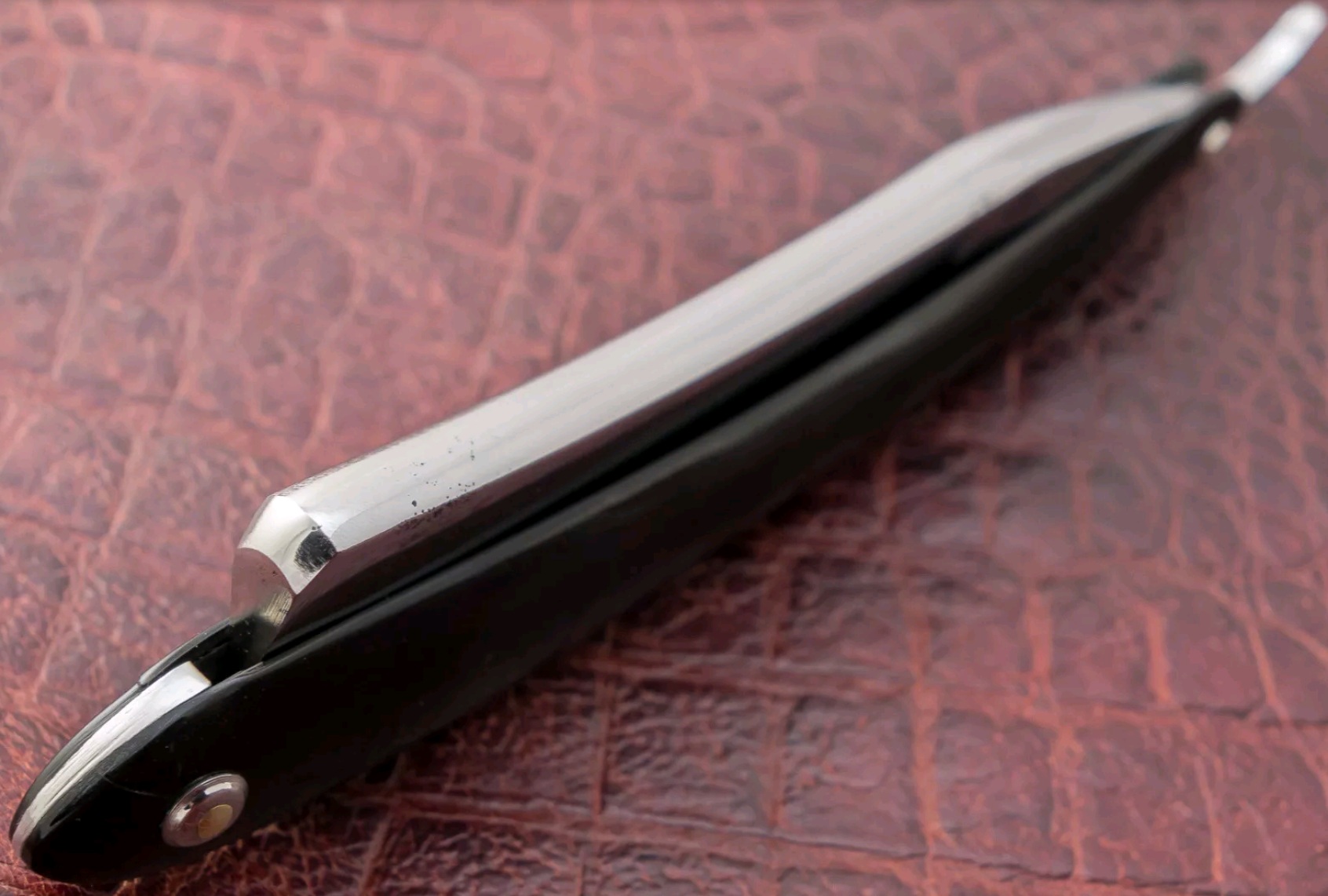 Касательно реставрации. В описании было следующее: I have lightly restored this razor. The characteristic cracks in the wedge end of the scales are fully stabilized (the bigger, heavier razors from this era almost always have these cracks because of the weight of the blade), and I've restored the factory 'two tone' surface treatment with a crocus polished blade face and glazed tang and tail. Some signs of age remain.