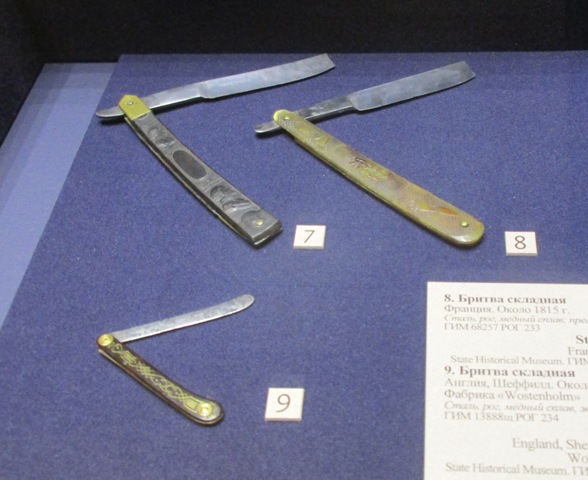 «У хорошо выбритого мужчины более высокие мысли, нежели у небритого» — эту фразу, со ссылкой на Стерна, автор труда по «элегантности и гигиене» выносит на обложку своего творения (отмечая уже в собственно тексте: «большинство мужчин ухаживают за подбородком каждое утро; некоторые денди бреются два раза в день«). Ну, а кураторы выставки не забывают поместить в экспозицию бритвы — вот какими пользовались в начале XIX века. https://diletant.media/blogs/67288/34973937/