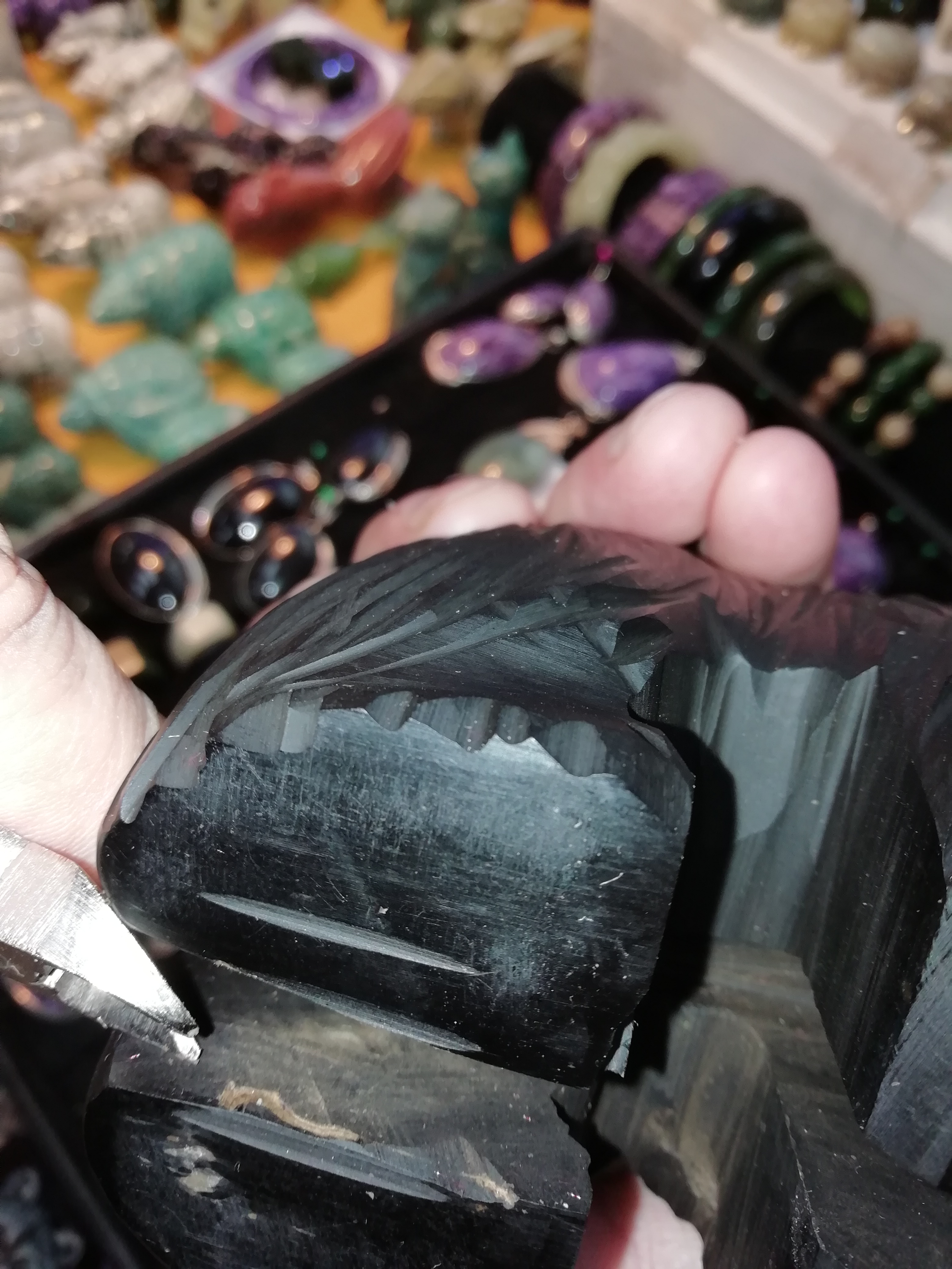 "По своей сути это битуминозный уголь (или как сейчас принято считать — псевдоморфозное замещение древесины битумом), имеет многочисленные синонимы, подчеркивающие внешние признаки — черный янтарь, черная амбра, смоляной уголь и др. Сложение однородное, но может быть и неоднородным. Излом раковистый или ступенчатый, спайность отсутствует. Твердость 3-4 по шкале Мооса. Удельный вес 1,3-1,4. Цвет черный или коричневый (бурый), блестящий, прочный, вязкий. Блеск тусклый, матовый до смолистого. Внешне похож на черный вар или смолу с тусклым блеском. Горит ярким коптящим пламенем, со специфическим запахом нефтепродуктов (битумов). Сибирские крестьяне даже использовали гагат вместо свечей, сжигая на специальной подставке (камне). В отличие от других разновидностей углей гагат, при надлежащем уходе, может сохраняться в изделиях без образования трещин десятилетия и даже столетия." отсюда - http://lavrovit.ru/?page_id=1172 Вот та хрень, что внизу на фото - тоже была на выставке... Ещё Гагат, или, как его называют на Кавказе, гишер, - разновидность ископаемого угля, особенно богатая битумом. По степени перерождения растительных остатков уголь занимает промежуточное положение между настоящим каменным и бурым углем. Детальное изучение разных гагатов под микроскопом, проведенное Ю. А. Жемчужниковым, показало, что в гагате почти всегда сохраняется структура той древесины, которая дала ему начало. Гагат обладает довольно большой вязкостью. В противоположность каменному углю не хрупок, а в пластинках даже обладает некоторой гибкостью. Твердость гагата относительно невысокая, и он хорошо обрабатывается и шлифуется. Если в свежем изломе и в опилках гагат несколько буроват, то после шлифовки и полировки приобретает черный цвет; излом раковистый, матовый. Скульптура из гагата сохраняется довольно хорошо. отсюда - http://iznedr.ru/books/item/f00/s00/z00 ... t019.shtml там ещё много инфо+ ... полируется гагатовое изделие (кавказ, старый рецепт) порошком каштанового угля с помощью мягкой тряпочки. В процессе работы гагат смачивается водой. После полировки готовое изделие еще часа два-три держат в воде, затем вытирают и, завернув в тряпки, помещают в ящик и оставляют там на месяц. После такой сушки, как указывает Рехвиашвили, гагат хранится тысячелетия. Сразу после добычи сибирский гагат (матаганский/гороховский - иркутские) легко обрабатывается топором; он еще очень мягкий, имеет совершенный раковистый излом. На воздухе становится твердым, и топор перестает его брать. Гагат хорошо пилится круглыми пилами, проволокой и лентой, обрабатывается алмазными и другими абразивными кругами. Куски его обтачиваются на токарном станке твердосплавными резцами. Окончательная зачистка изделий ведется наждачной или стеклянной шкуркой. Шлифуется и полируется гагат мокрой пастой, сначала пемзовой, а потом обычной полировальной. Сибирский гагат долго сохраняет полировку. Если нагреть его до 200°, он становится мягче, а при 400° пластифицируется. Мелкие обломки сибирского гагата под прессом при нагревании спекаются и становятся пригодны для изготовления резных изделий. За это свойство сибирского гагата спекаться его иногда называли черным янтарем. Изучение сибирского гагата, проведенное М. Д. Залесским, показало, что в его составе преобладает аморфная бурая битуминозная масса, в которой много округлых частиц 