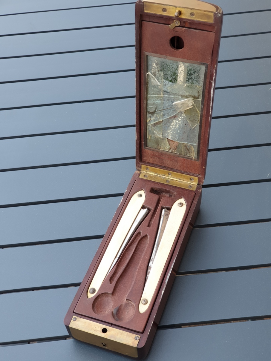 У нас на рынке года два назад такой набор джентльмена продавался, с фамильными вензелями на крышке. Все предметы были на месте, но из двух бритв на месте была только одна.. Просил пятнашку, "чот" жаба придушила..)) Бесит, когда приходится пользоваться бритвой моложе себя...