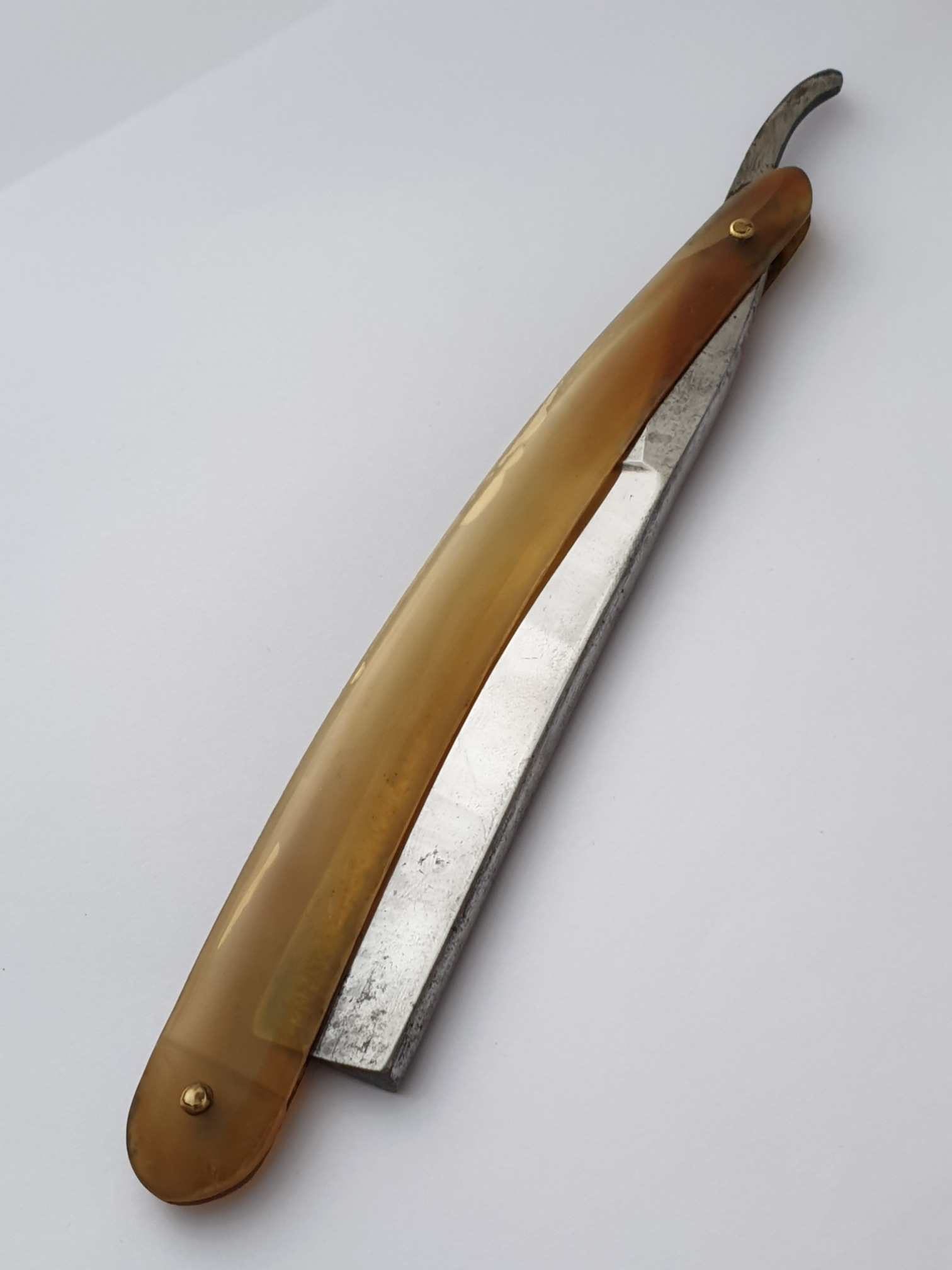 Продаётся от S&T44. Шеффилдский клин в весьма почтенном возрасте, Joseph Rodgers и сыновья. Форма клинка и хвостовика характерны для первой половины XIX века. Ширина клинка 16мм. Ручка из рога, переставлена с бритвы-донора. На фото рабочая кромка практически не видна, но она есть, тонкая и ровная))) Бритва заточена.