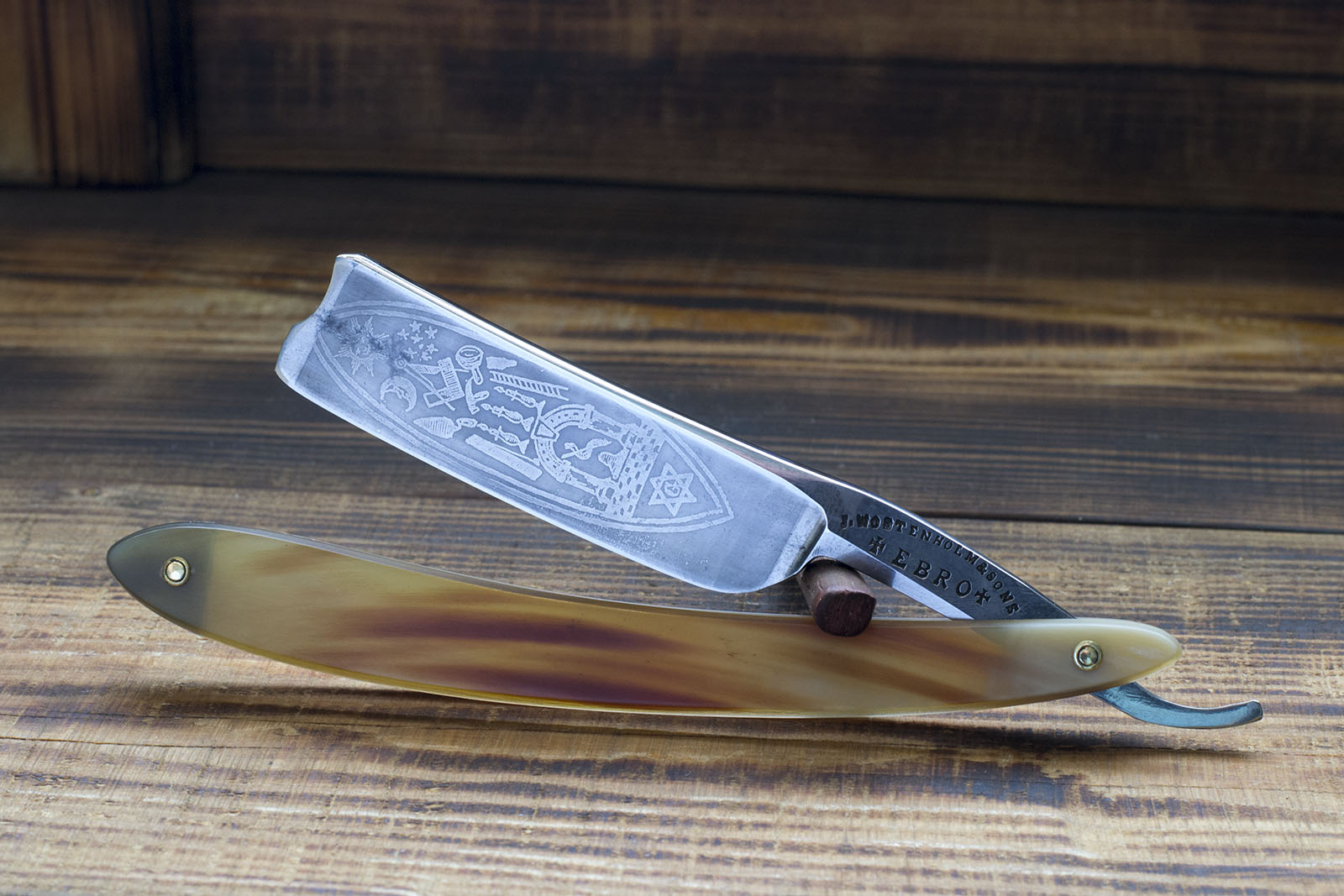 Одна из редких бритв моей коллекции - английский клин от Joseph Wostenholm, торговой марки EBRO. На полотно нанесено травление с символами масонства и поскольку резист перед травлением наносился вручную, каждую такую бритву можно считать отдельным штучным произведением искусства того времени. Бритва произведена середине 19 века, выполнена из качественной углеродистой стали, геометрия полотна на довольно высоком уровне, поэтому было решено оставить бритву в максимально оригинальном состоянии с. Я всего лишь отполировал полотно, немного поработал с травлением и произвел заточку, так же была изготовлена новая рукоять из рога африканского буйвола. Ширина 21 мм., бритва заточена и готова к бритью, отличный коллекционный экземпляр в редкой сохранности. продано EBRO Show