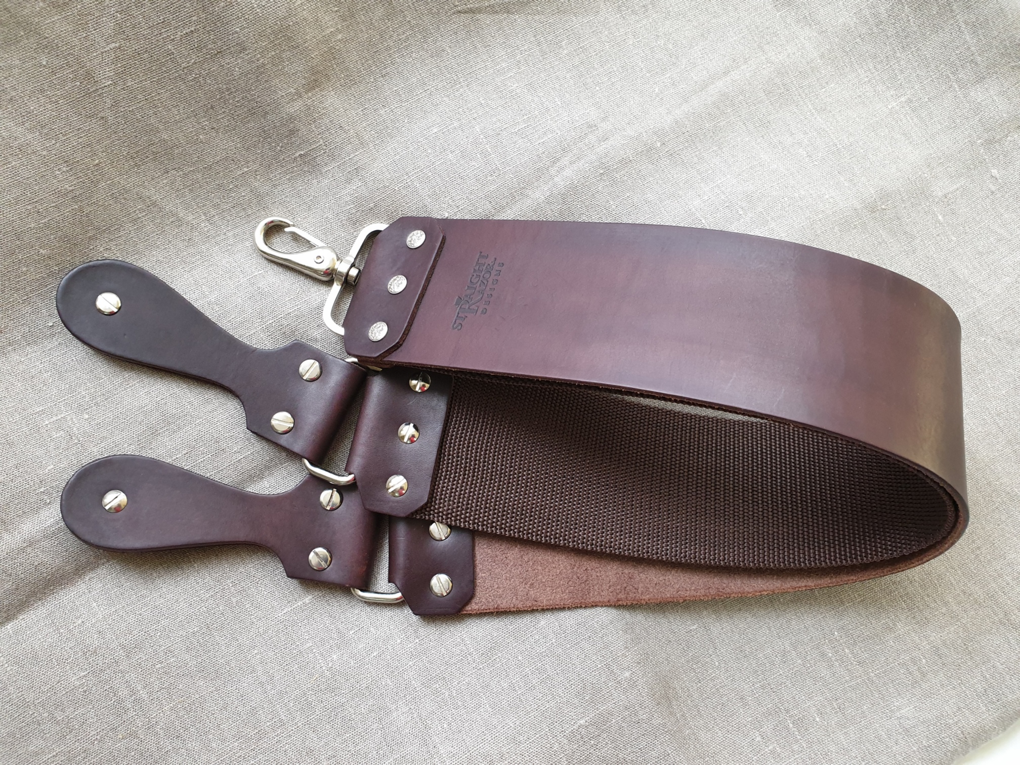 Продаётся от S&T41. Еще один ремень для правки бритв, очень популярная среди американских коллег модель 3" PREMIUM IV (LONG) ENGLISH BRIDLE от закрытого уже бренда Ллина Абрамса Straight Rasor Design, США. Модульная разборная конструкция, размер рабочей зоны для правки 7,6 х 50,7 см. Небольшая коцка на правом ребре, в остальном - без замечаний.