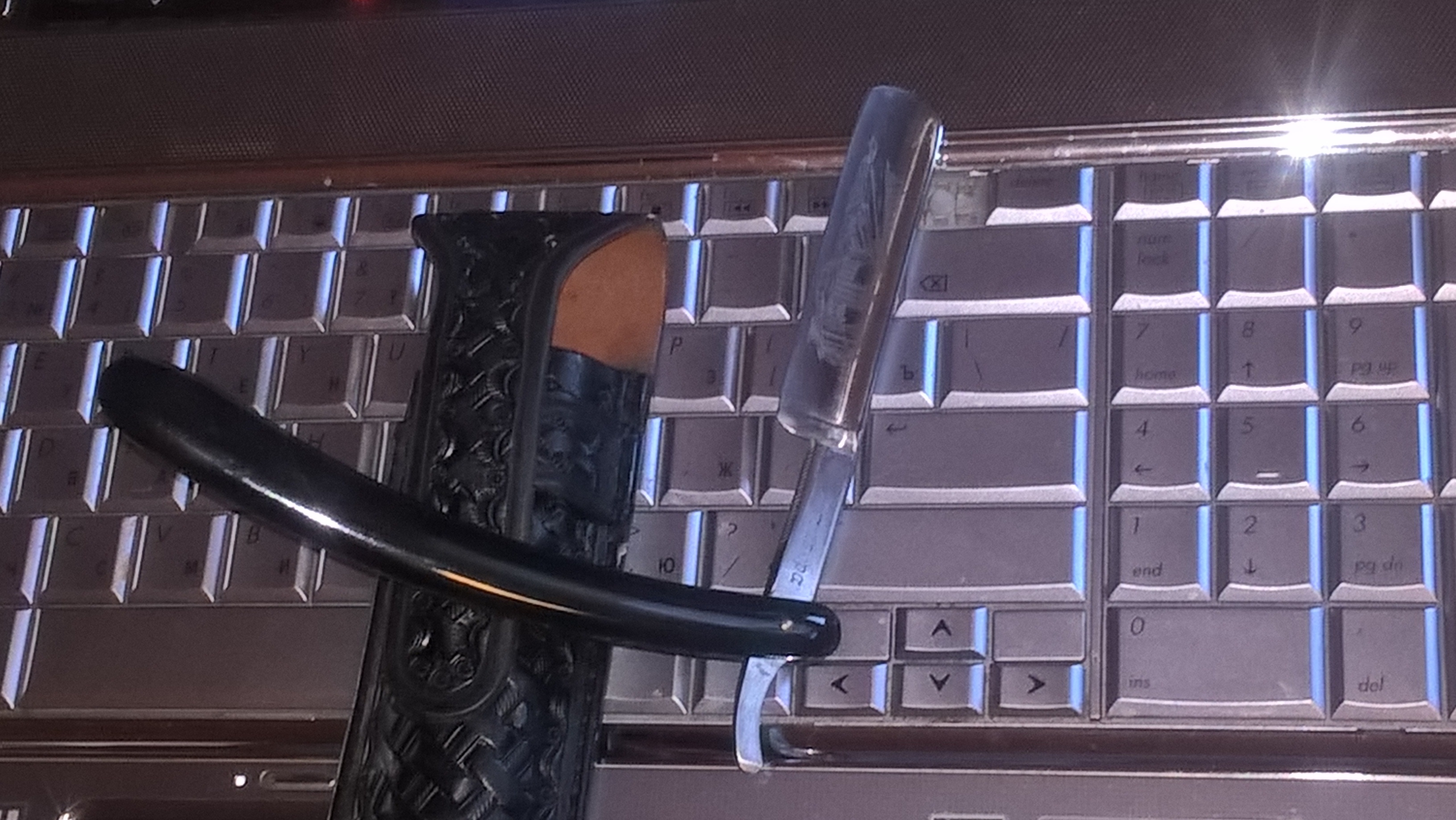 Первая бритва появилась в арсенале от RuslanK - C.V. Heljestrand, Eskilstuna. При встрече взял еще и подвесной ремень. Руслан доходчиво изложил курс «молодого бойца», заодно показав, как править на ремне РК. Что, кстати, не помешало мне покоцать кожу… Причем не только на ремне, но и на морде лица. Но последнее, очевидно, сделано было с умыслом, исключительно в медицинских целях, в соответствии с рекомендациями врачей эпохи Возрождения о полезности кровопускания… Кажется, жена поверила. Или сделала вид, что поверила.