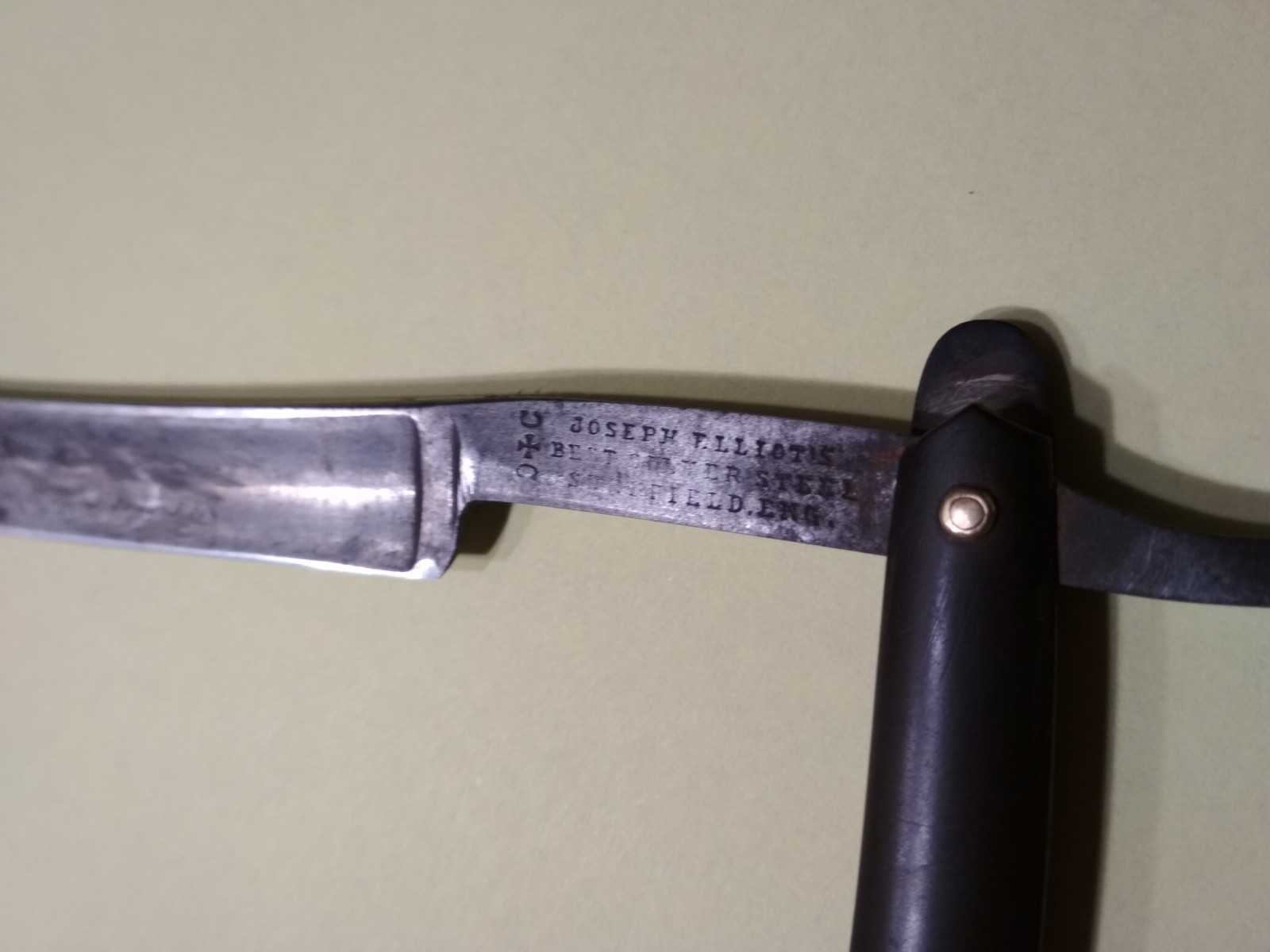 Re: Joseph Elliot's, SheffieldRe: Joseph Elliot's, SheffieldВ копилку. Досталась мне почти за даром, состояние печальное. Очистил наточил, будет возможность поменяю ручку. На лезвии надпись но немогу пока разобрать, не все буквы видно. Подскажите примерный возраст. Сталь отменная, броет очень мягко. Обушек не толстый, ширина около 14 мм. Нелюблю массивные бритвы, с крупными ручками, это очень изящная.