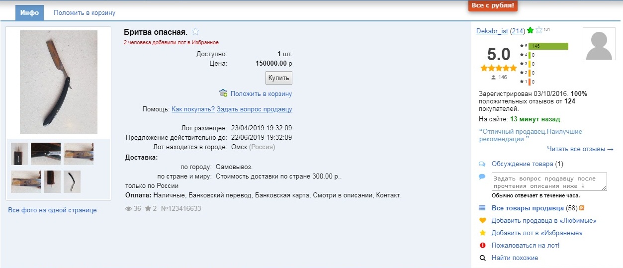 Однако, хитрый барыга. Разместил вторым лотом, чтобы на торгах сорвать побольше. Опомнитесь! Видно ведь, что бритва коцаная.