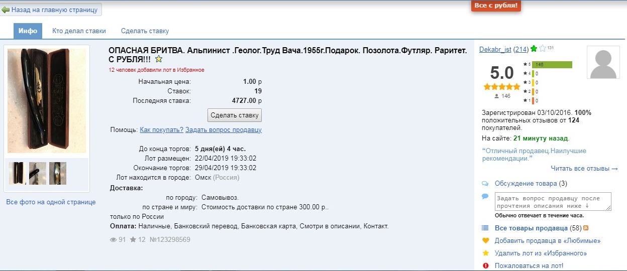 Аукционы: плагиат, развод и "великолепные" описанияim-g, он не поэтому вторым разместил. У него еще фотки запросили, а по правилам еслт есть ставка, то фотки подгрузить нельзя. Коцка да, есть, у пятки на кромке. Когда цена перешла за 3.5 т.р. я перестал участвовать. Как инструмент для бритья она того не стоит, может только как коллекционная вещь, но блин эта конца