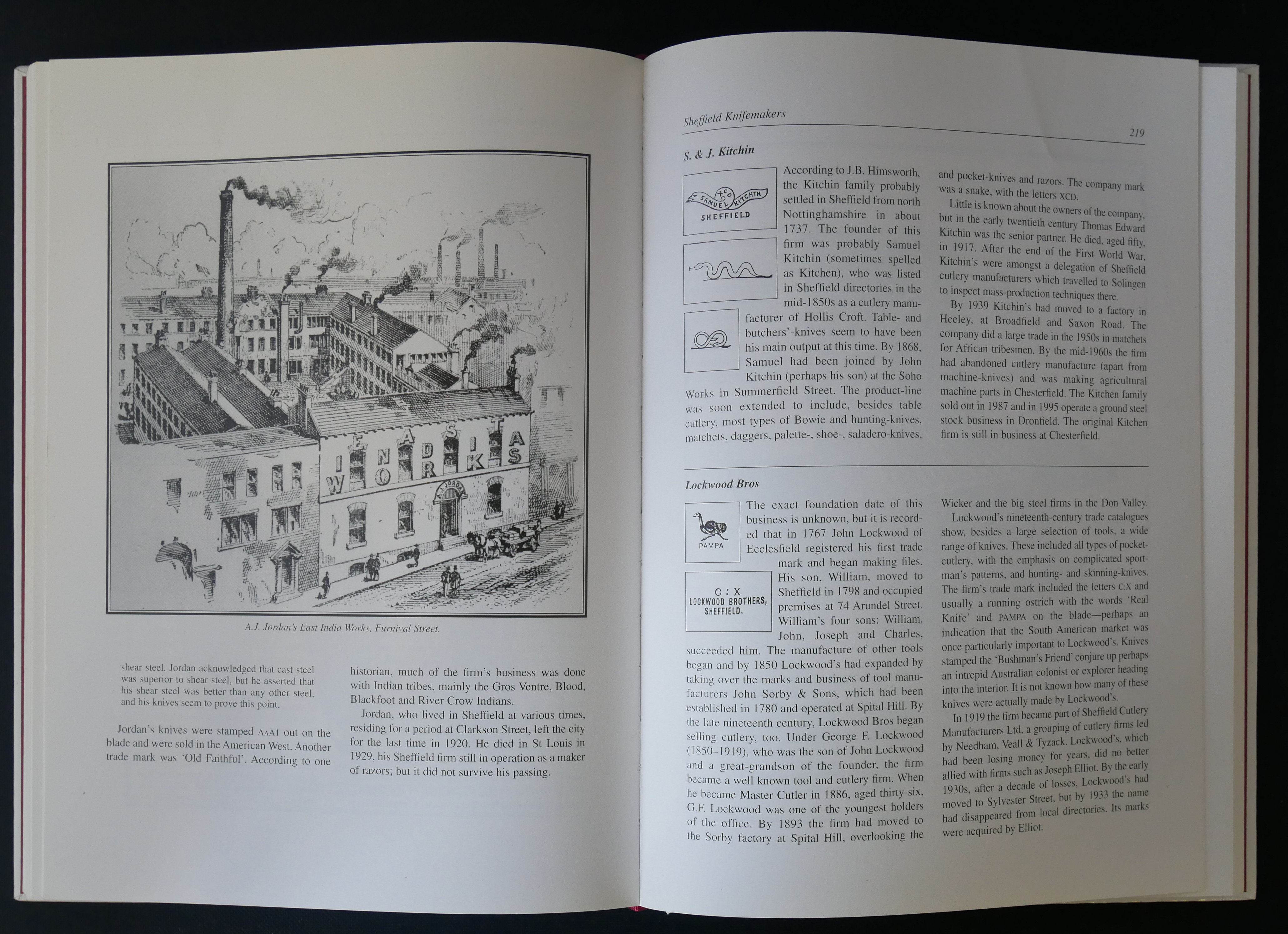 Author: TWEEDALE Geoffrey Title: The Sheffield Knife Book, A History And Collectors' Guide Year: 1996 Edition: 1st Publisher: The Hallamshire Press City of Publication: Sheffield Summary: 320 pages, large 8vo., illus in colour and b/w from photographs, drawinsg etc., pictorial laminated cover. A fine copy covers the history, the knives, identification and dating, leading manufacturers etc.