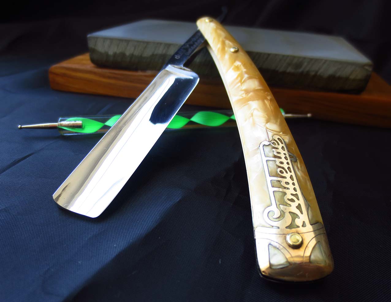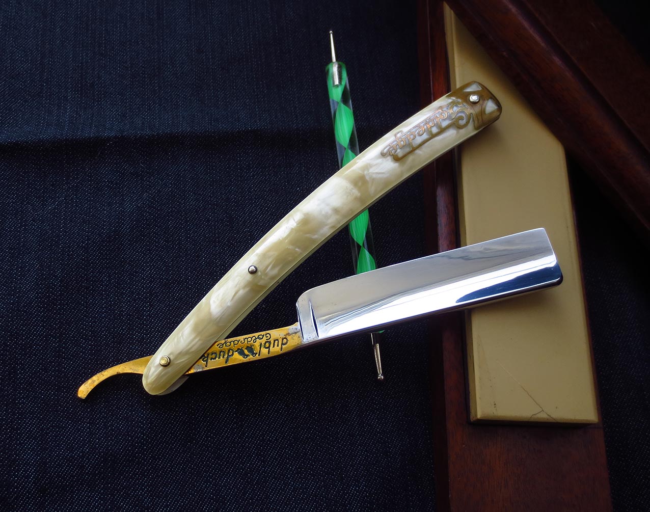 Опасная бритва "Dubl Duck" Goldedge Solingen-Germany. Углеродистая сталь, полная вогнутость, ширина полотна - 5/8 дюйма, пластиковая оправа под перламутр, всё родное, заводское. Бритва заточена на японских камнях и протестирована на себе лично. Бреет мягко и нежно, как уточка щиплет молодую травку на лужайке..)) После всех работ и тестов инструмент продезинфицирован, направлен и находится в полной готовности для борьбы с вашей щетиной. Также всегда есть в наличии ремни для правки опасных бритв из натуральной кожи, при покупке ремня и бритвы скидка на доставку. Начинающим подскажу и покажу, как пользоваться и ухаживать за утятами...) Цена - 7550 рублей. Бесит, когда приходится пользоваться бритвой моложе себя...