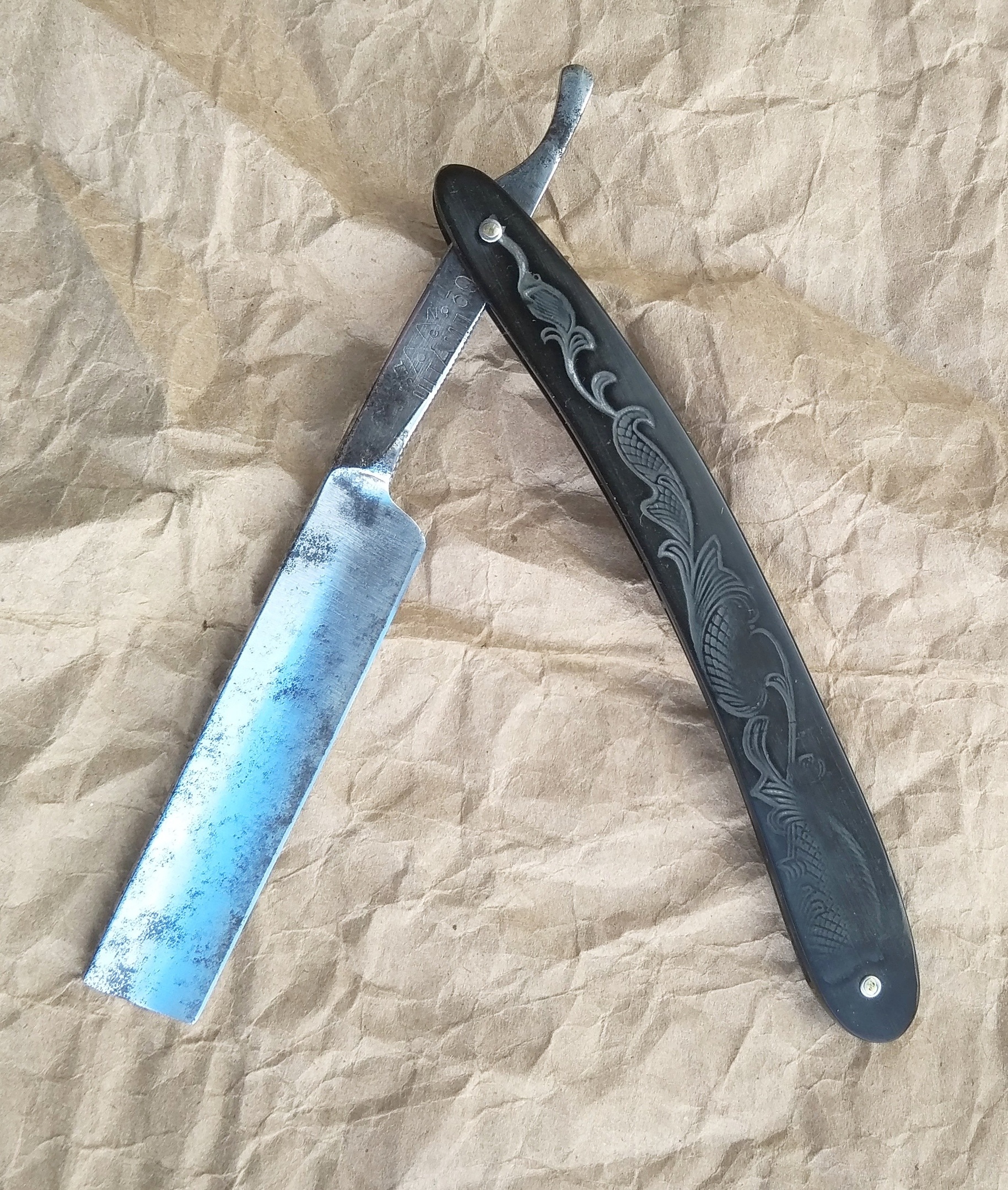 Бритва до... и после...Одна из бритв, которыми занимался на майские. В принципе, нет ничего особенного, просто Москва 50 г. Вручную почистил, проклеил трещину у нижнего пина, убрал обратку, сформировал улыбку, заточил. На все ушло чуть больше часа