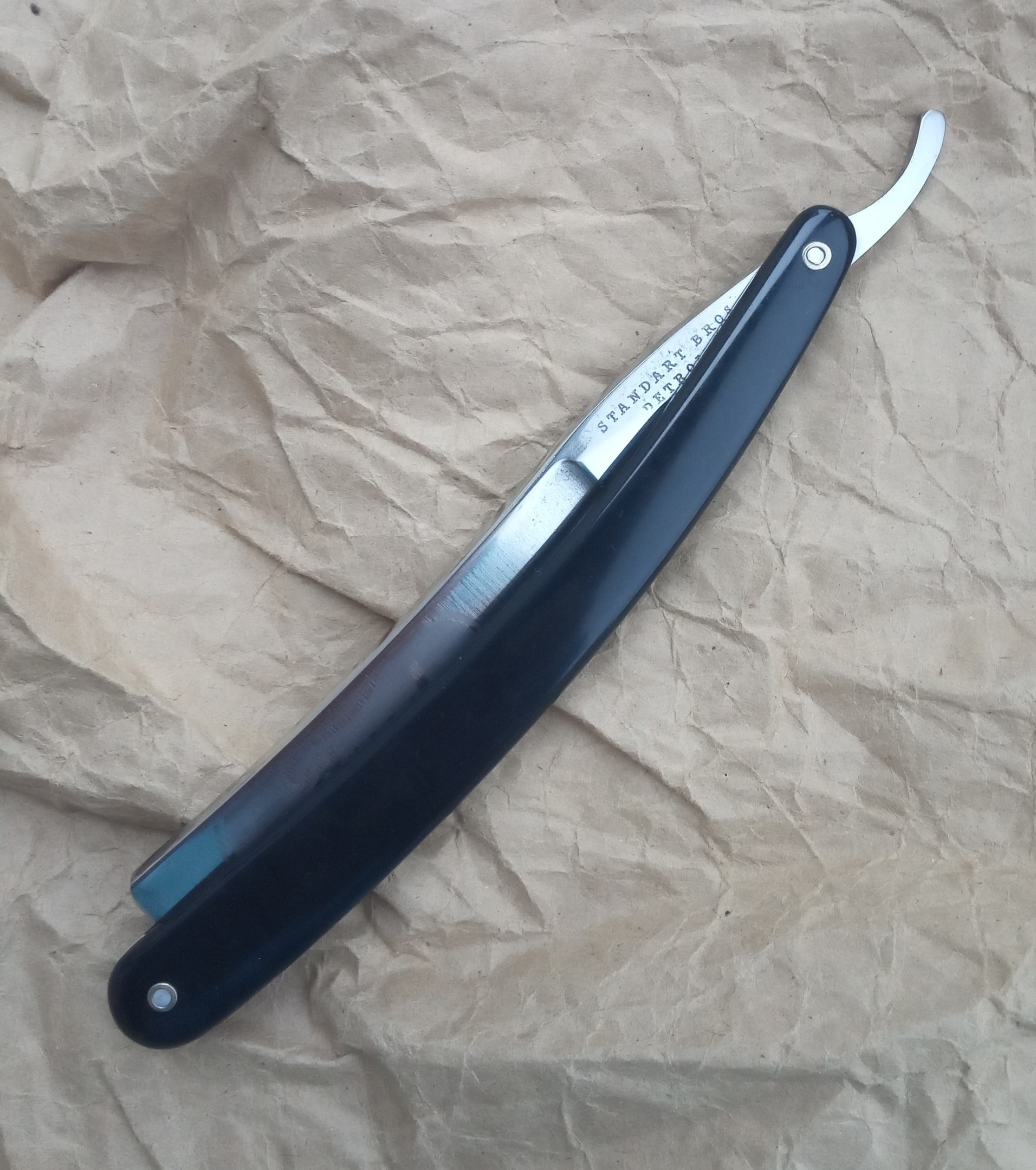 Произведена в начале ХХ века. Сделал травление логотипа одной детройтской компании, утверждённого в 1912 году. Клинок - 14мм выборка близко к клину. Оправа - пластик с француженки. Заточена. Очень приятное бритьё. Цена: продано.