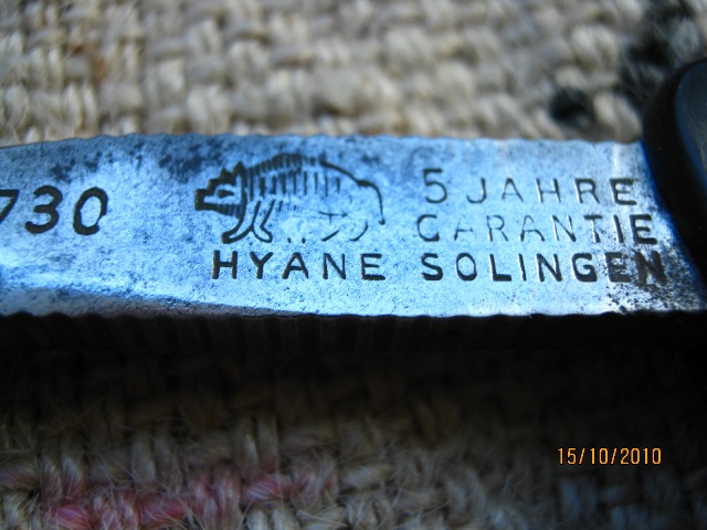 Торговая Марка "Hyäne" (гиена) с клеймом . Фирма основана в 1889г., Gustav Iserloh, Solingen - активно работала 1922-1925 годах. Числилась в списках 1939г.. ТМ: '5 Jahre Сarantie', 'Hÿane', 'Scorpion', 'Kronprinz', 'Schwein', 'Wildschwein'.