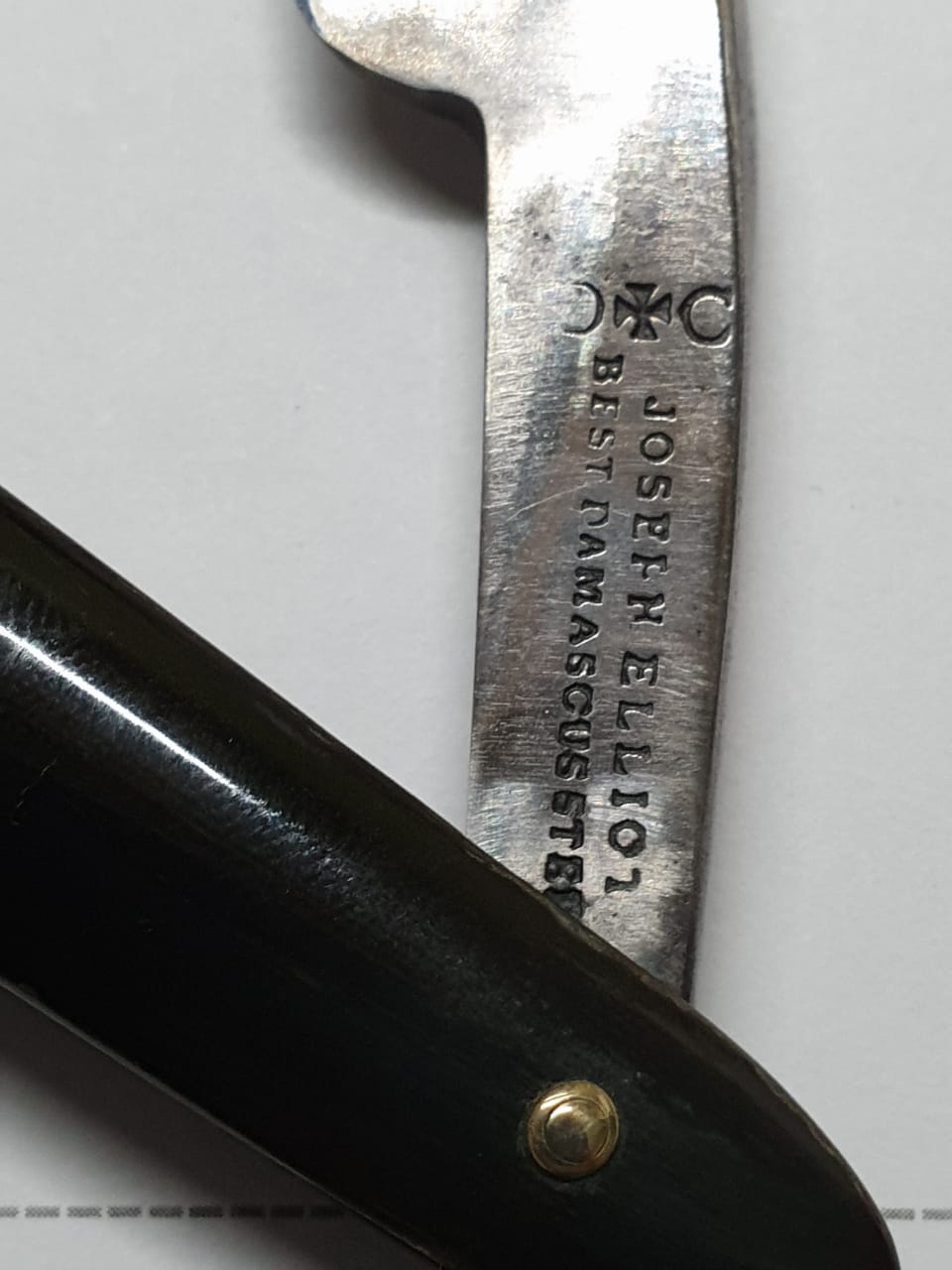 Обзор бритвы с сайта: бритва-опасная.рфУ меня есть сильно винтажный клин made for the army производства Joseph Elliot с надписью на эрле прямо в составе клейма - best damaskus steel. При этом сталь без многослойного рисунка, вполне такая внешне традиционная. Но патиной сильно быстрее остальных углеродок покрывается, темнеет равномерно по всей поверхности.
