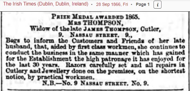 госпожа THOMPSON, вдова катлера James Thompson, сообщает Клиентам и Друзьям своего покойного мужа о том, что при содействии первоклассных рабочих она продолжает вести бизнес таким же образом, каким он был в течение последних 30 лет.