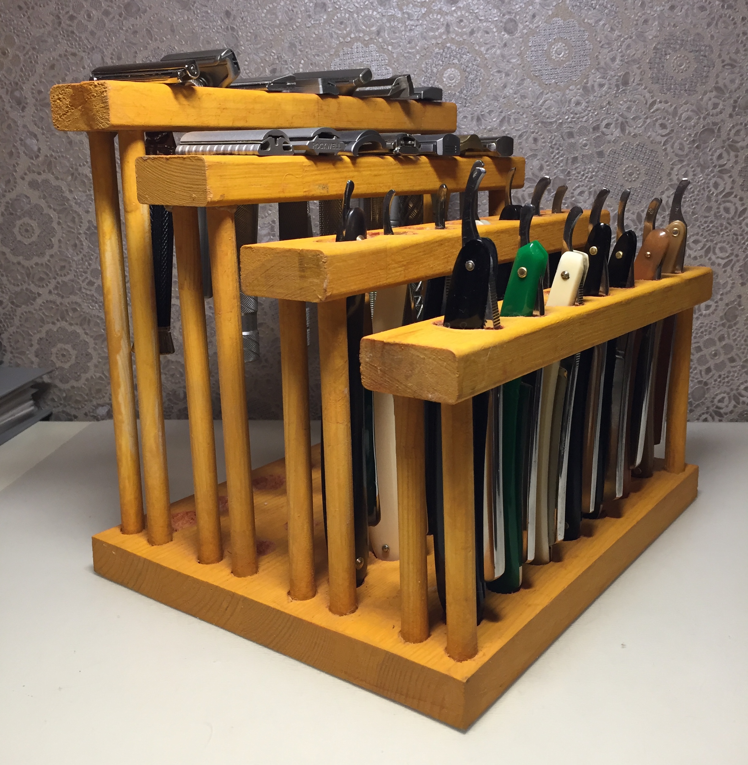Подставка для бритв и прочего. ИзготовлениеУ меня, например, бритвы вообще не сохнут, потому что не мокнут (в конце только полотно чуть под струей промываю). Тряпочкой протираю полотно и эрль. Осевой узел, хвост и ручка с водой не контактируют