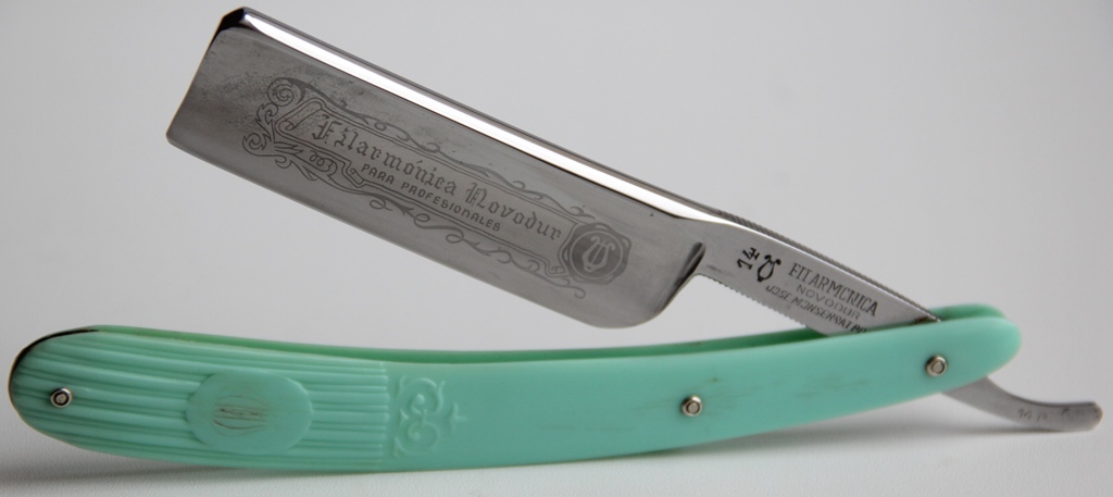 FILARMONICA 14 "NOVODUR" Jose Monserrat Pou Ширина полотна-24.5 мм или почти дюймовый! Толщина обушка-7 мм Полная вогнутость. Испанская углеродистая сталь. Середина 20-го века. Бритва в прекрасном состоянии для своих лет, с минимальными, еле заметными следами пользования. Не разбиралась и не ремонтировалась. Всё в оригинале и с оригинальным гриндом полотна. Очень аккуратное пользование.Клинок без царапин, ржавчины или других видимых дефектов. Идеальная геометрия полотна.Тяжёлая, мощная бритва, с красивой бирюзовой ручкой.Сталь, как и в предыдущем варианте, "звенящая" и качественная.Отличный вариант для тех, кто хочет иметь огромную Филармонику по формуле цена/качество. Бритва будет заточена и полностью подготовлена к бритью. Цена-19500 р с доставкой. ПРОДАН Spoiler Show