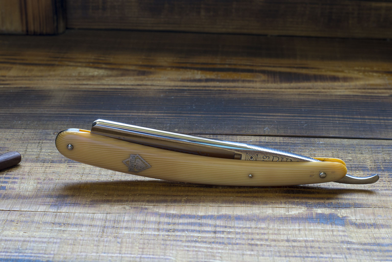 Старый клин, с прекрасной геометрией, изготовленный из качественной углеродистой стали во Франции. К сожалению период производства определить затруднительно, французы долгое время были приверженцами классических форм и подобные полотна выпускались до начала 20 века, но по косвенным признакам - форме родной рукояти и состоянию рога рискну предположить что это 70-80 гг 19 века. Бритва имеет крайне удобный эрль с подпальцевой выемкой, массивный широкий обух, ширина полотна 18.4 мм, отлично подходит для повседневного бритья и окантовки. Фаска режущей кромки тонкая и равномерная, свидетельство правильной геометрии полотна. Форма полотна уравномерно улыбчивая, что так же считаю несомненным плюсом. Бритва имеет новую роговую рукоять, изготовленную в соответствии с оригинальной, заточена и готова к бритью. Продано Volpiliere Fils. Show
