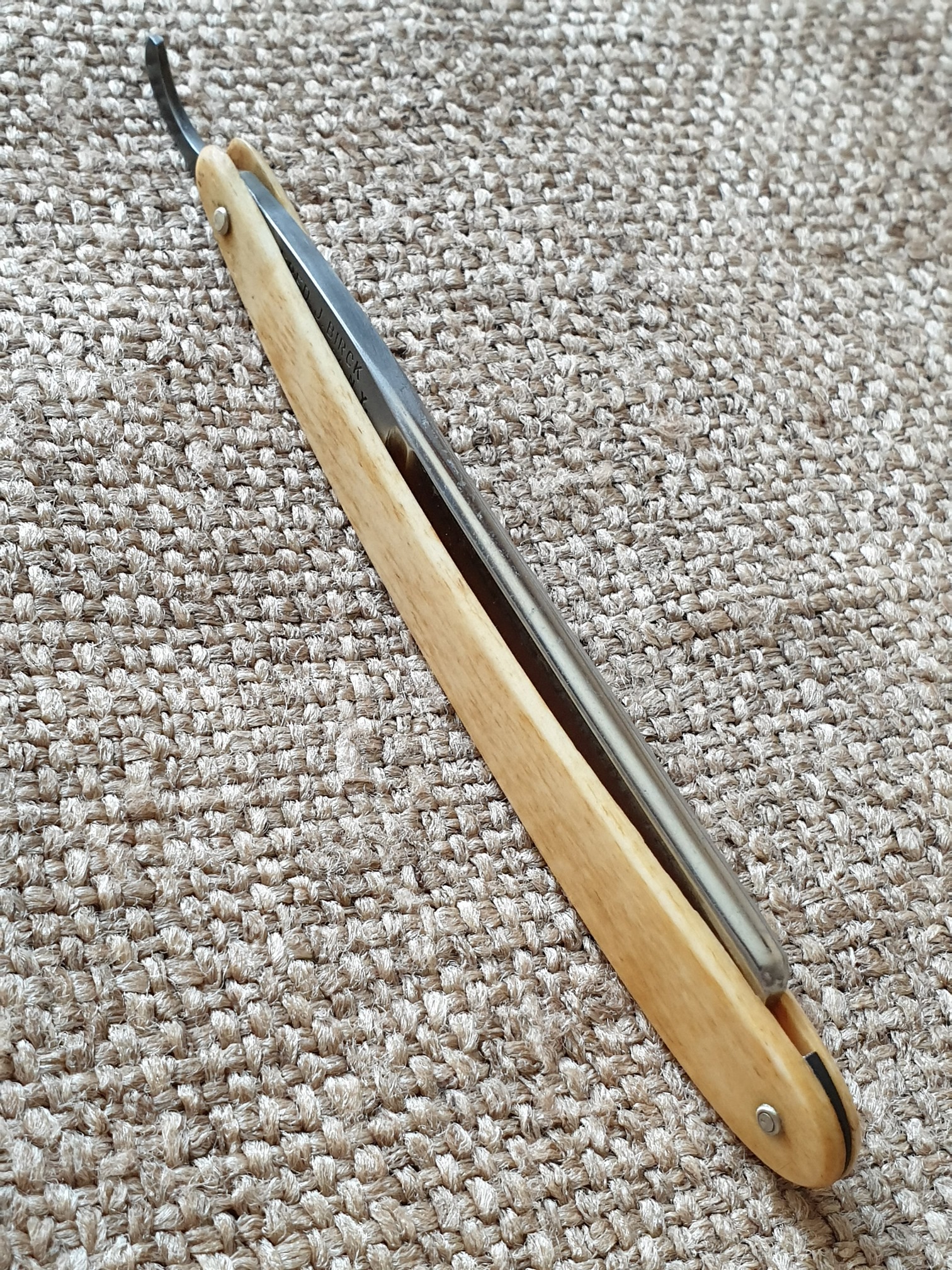 Продаётся от S&T56. Бритва под восстановление, продается как есть. Bengall cast steel, ширина клинка 17мм, обух 4мм, длина рабочей кромки 70мм. Ручка вероятно не родная, целлулоид, ровная, без дефектов.