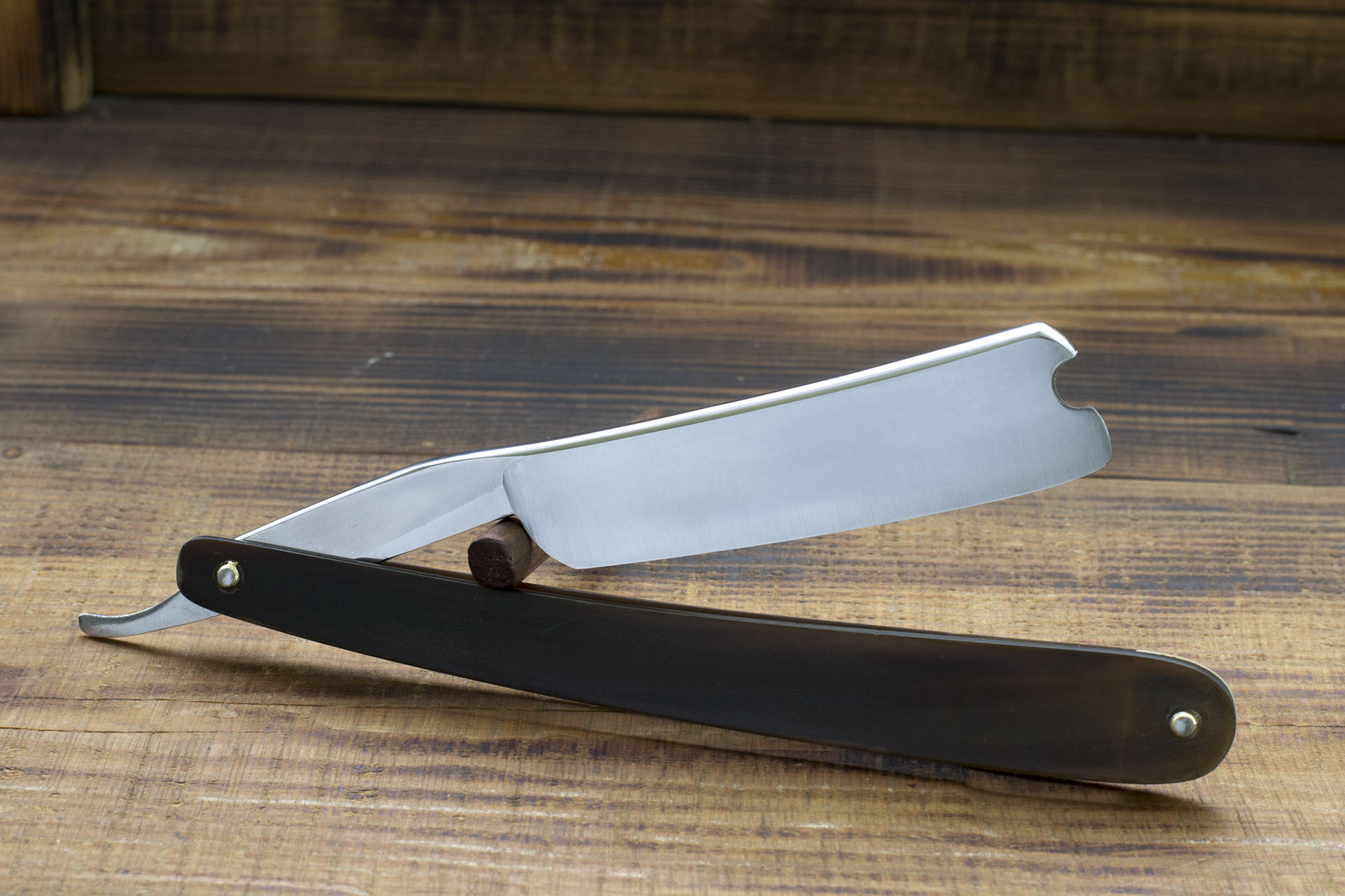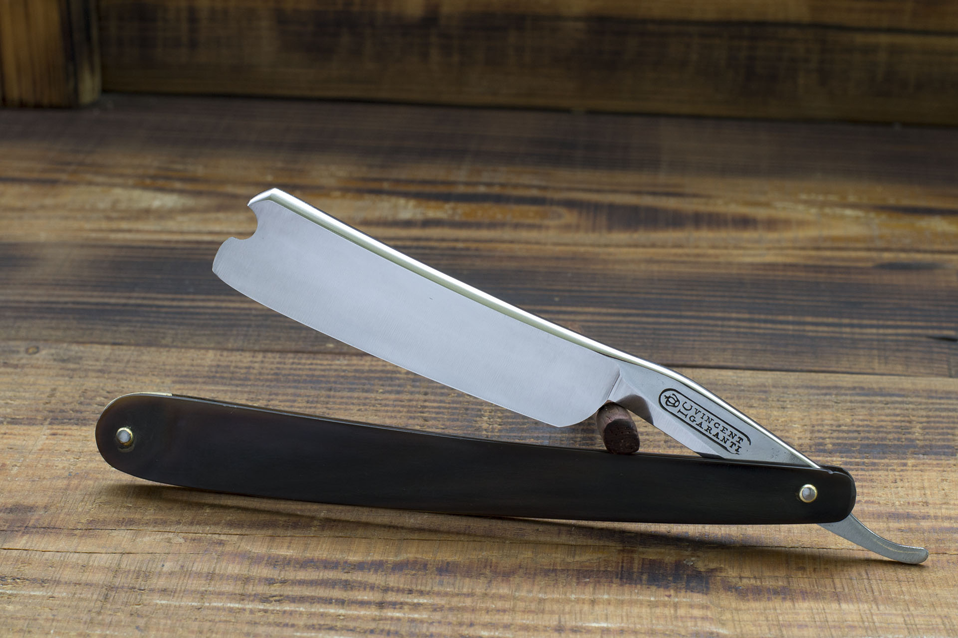 Мощный французский клин от Vincent et Pény, торговой марки I.C. Vincent. Данные бритвы всегда радуют постоянством качества и оригинальной формой полотна, присущей бритвам старой Франции. При реставрации удалось полностью сохранить все оригинальные атрибуты, плоскую роговую рукоять, костяной клинышек и конусные латунные шайбы, встречающиеся лишь на антикварных французских бритвах. Максимальная ширина полотна 22 мм (7/8), массивный обух плавно расширяется к носику, достигая ширины в 6 мм., отличная геометрия, фаска режущей кромки тонкая и равномерная. Бритва изготовлена из качественной углеродистой стали, на мой взгляд одной их лучших. Полотно имеет легкую улыбку и парикмахерский вырез, деталь, делающая бритву гораздо более привлекательной внешне. Так же к достоинствам полотна можно отнести глубокое ударное клеймо на эрле. Очень часто бритвы марки I.C. Vincent имеют неглубокое или неравномерное клеймо, которое частично утрачивалось еще при первичной шлифовке полотна на фабрике. Ориентировочно, бритва изготовлена во второй половине 19 века. Заточена и готова к бритью. Продано vincent Show