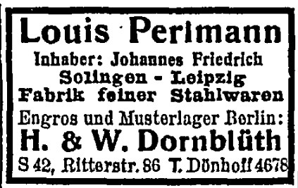 С середины двадцатых и до 40х в шапках счетов-фактур и прочих документов указывают три города: Louis Perlmann Solingen-Leipzig-Berlin.