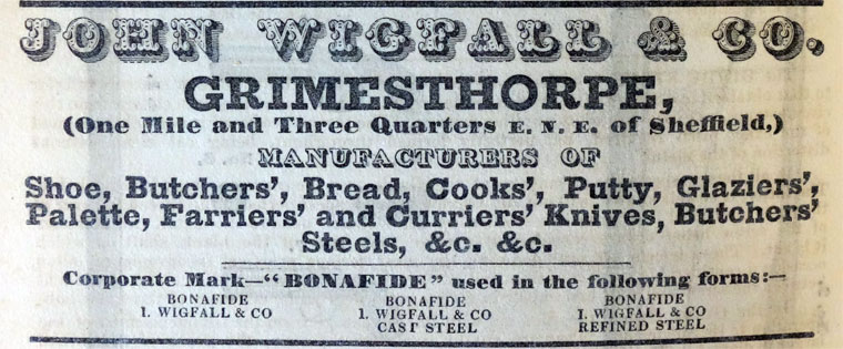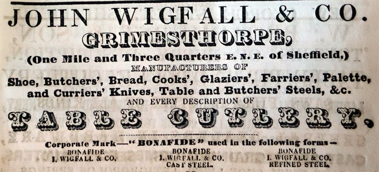 John Wigfall & Co “Bonafide” SheffieldJohn Wigfall & Co начали свою деятельность в 1843 году и были известными производителями в Шеффилде, хотя и имели малое количество сотрудников (максимальное количество сотрудников около 70 максимум в 1870-х годах). Вначале развития фабрика была известна ножами для мясников, к 1860-м годам стала известна ещё и столовыми приборами. К 1870-м годам столовые приборы пополнились разнообразием моделей ножей. В одном из их рекламных объявлений, показанном ниже, можно увидеть, что был целый ряд ножей, созданных для разных видов деятельности - обувной, кузнечной, разделочной (для мясников) и т. д.