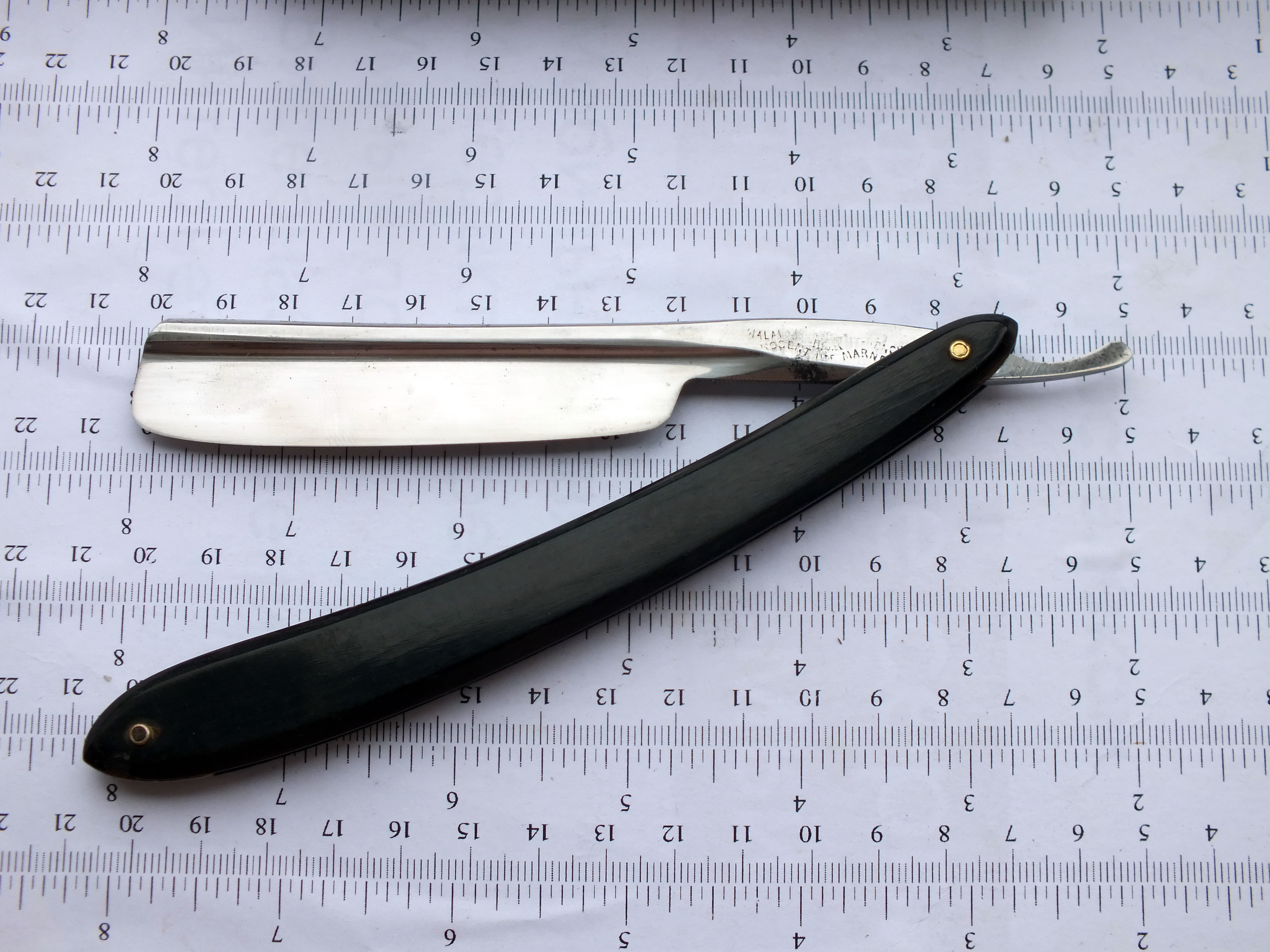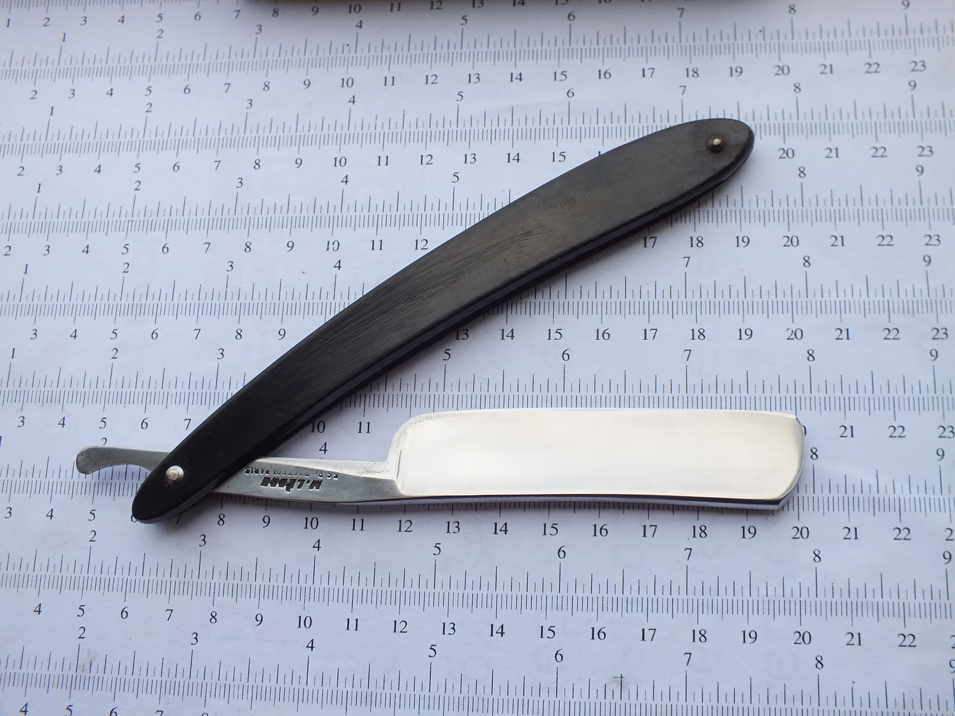 Конец 19 века. Ширина11/16, вогнутость 1/2 холлоу. Оправа рог, клинышек кость. Бритва заточена и готова к бритью. Продана на другом ресурсе. Spoiler Show