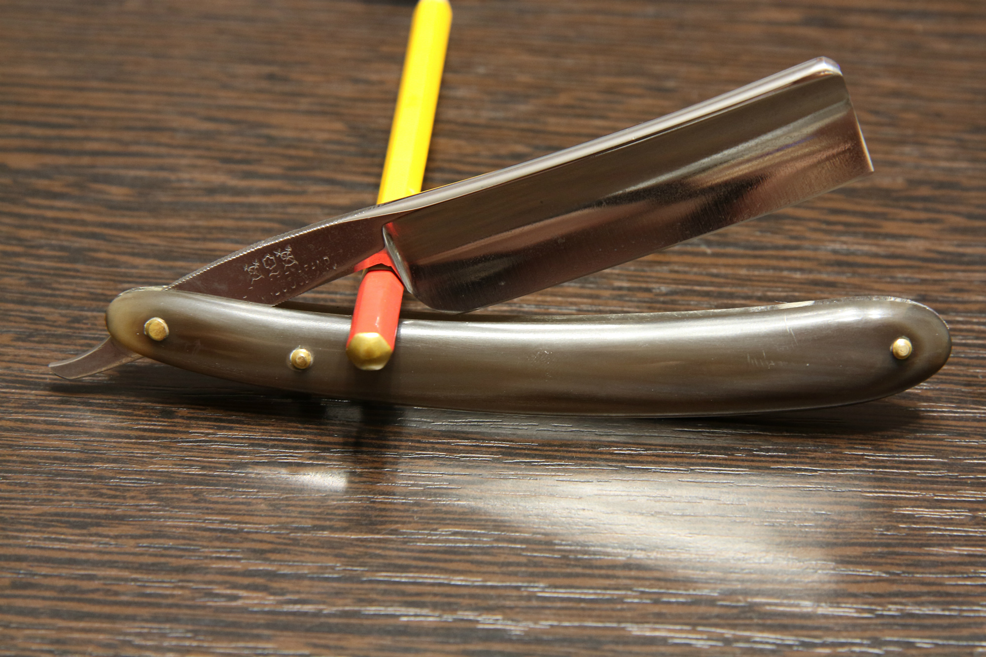 Опасная бритва Kaufmann, первая половина 20 века, сделана в г.Золинген (Германия), ширина полотна 22,5 мм, отличная углеродистая немецкая сталь, полная вогнутость, ручка заменена (сделана из рога буйвола, трехпиновая). Подготовлена мной к бритью (бреет отлично и без лишней агрессии). Крупная массивная бритва с огромным потенциалом по ширине. Цена - руб.