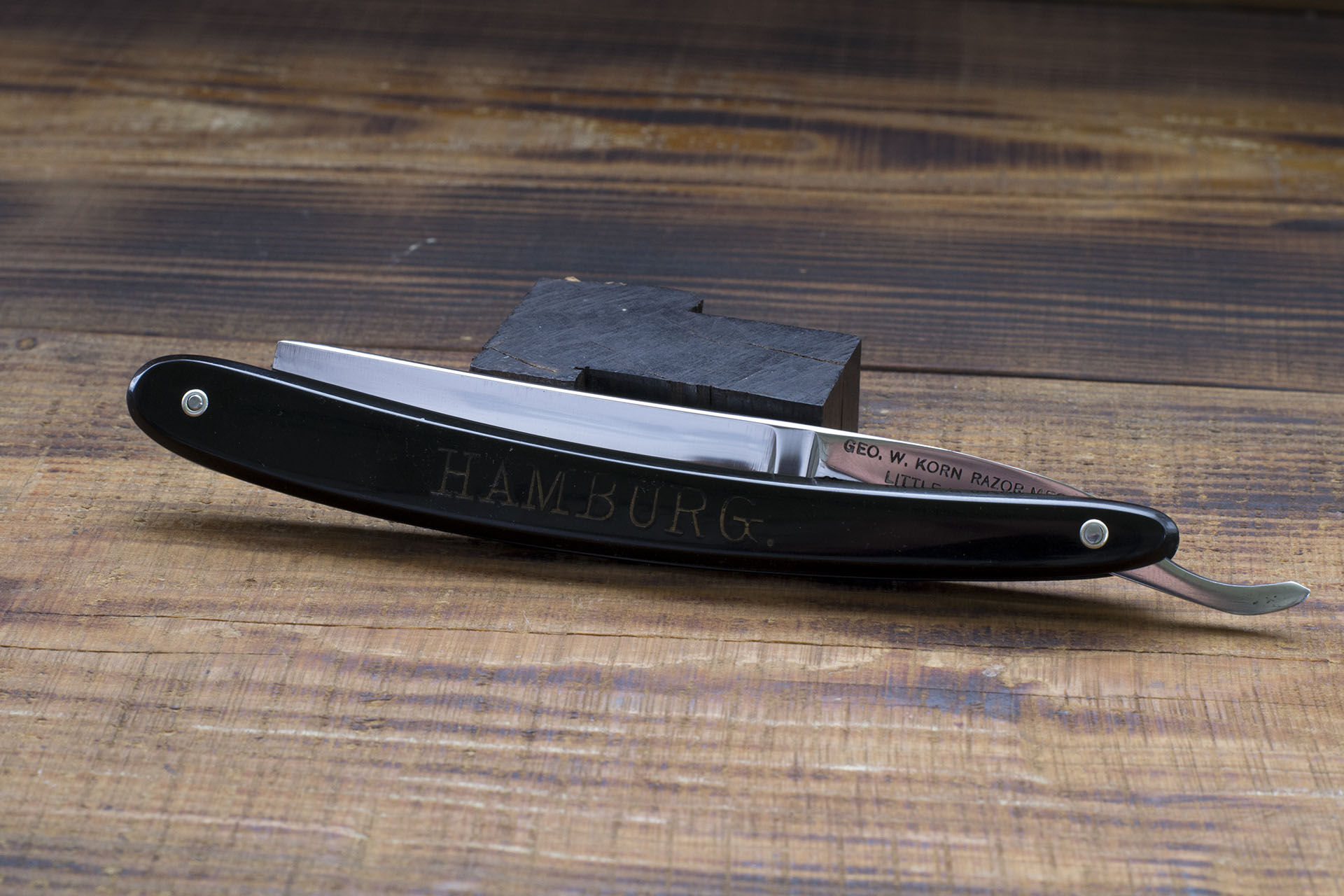 Опасная бритва начала 20 века, произведенная на предприятии Джорджа Уильяма Корна в Литл Вэлли, штат Нью-Йорк. Корн является довольно интересным и неординарным производителем, которому принадлежит ряд патентов в ножевом деле, а так же пара патентов на некоторые конструктивные особенности бритв. В частности на данном полотне применена технология American Double Hollow. По сути это хорошо известные бритвы с вогнутостью типа Bellied Hollow или "вогнутость с пупком" при которой на вогнутой части полотна бритвы отчетливо ощущается утолщение, полученное вследствие использования кругов двух разных диаметров при формировании вогнутости. Вещь действительно раннее известная и применяемая многими производителями, однако запатентовал ее именно Geo W. Corn. Так же к особенности полотна можно отнести его невероятную легкость и гибкость, бритва имеет очень тонкое и эластичное лезвие, которое может немного деформироваться при бритье, повторяя конутры лица. Об этом так же свидетельствует этикетка на коробке бритвы. Так же стоит упомянуть очень удобный эрль, отлично сидит в руке. Трудно сказать была ли бритва в использовании, я удалил коррозию с эрля, возможно туда просто попала влага, а вот кромка бритвы не была сведена окончательно, вероятно это заводская заточка, при которой лишь намечают режущую кромку не затачивая бритву до готовности. В комплекте так же родной футляр в состоянии нового. Ширина полотна 18 мм, родная рукоять из эбонита. Отлично подойдет для новичка. Заточена и готова к бритью. Продано Spoiler Show