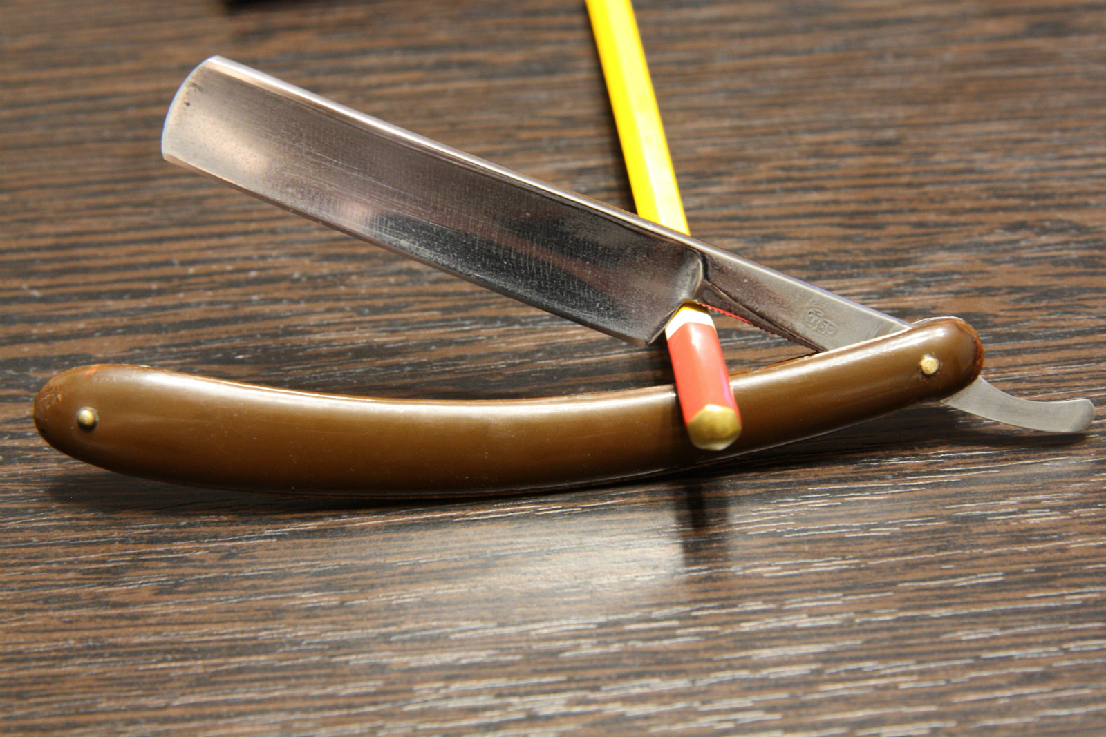 Опасная бритва Двухзаковная, завод СТИЗ, 1958 год. Ширина полотна 17 мм, легкая улыбка, ручка под янтарь, родной футляр. Ко мне попала с заводской заточкой (не пользованная), затачивалась мной впервые (подготовлена к бритью), полотно почистил от следов времени (кое что осталось, но не критично). Двухзаковная это двойная выборка, обеспечивающая легкость заточки/правки и дающая эффективное бритье. Цена - руб.