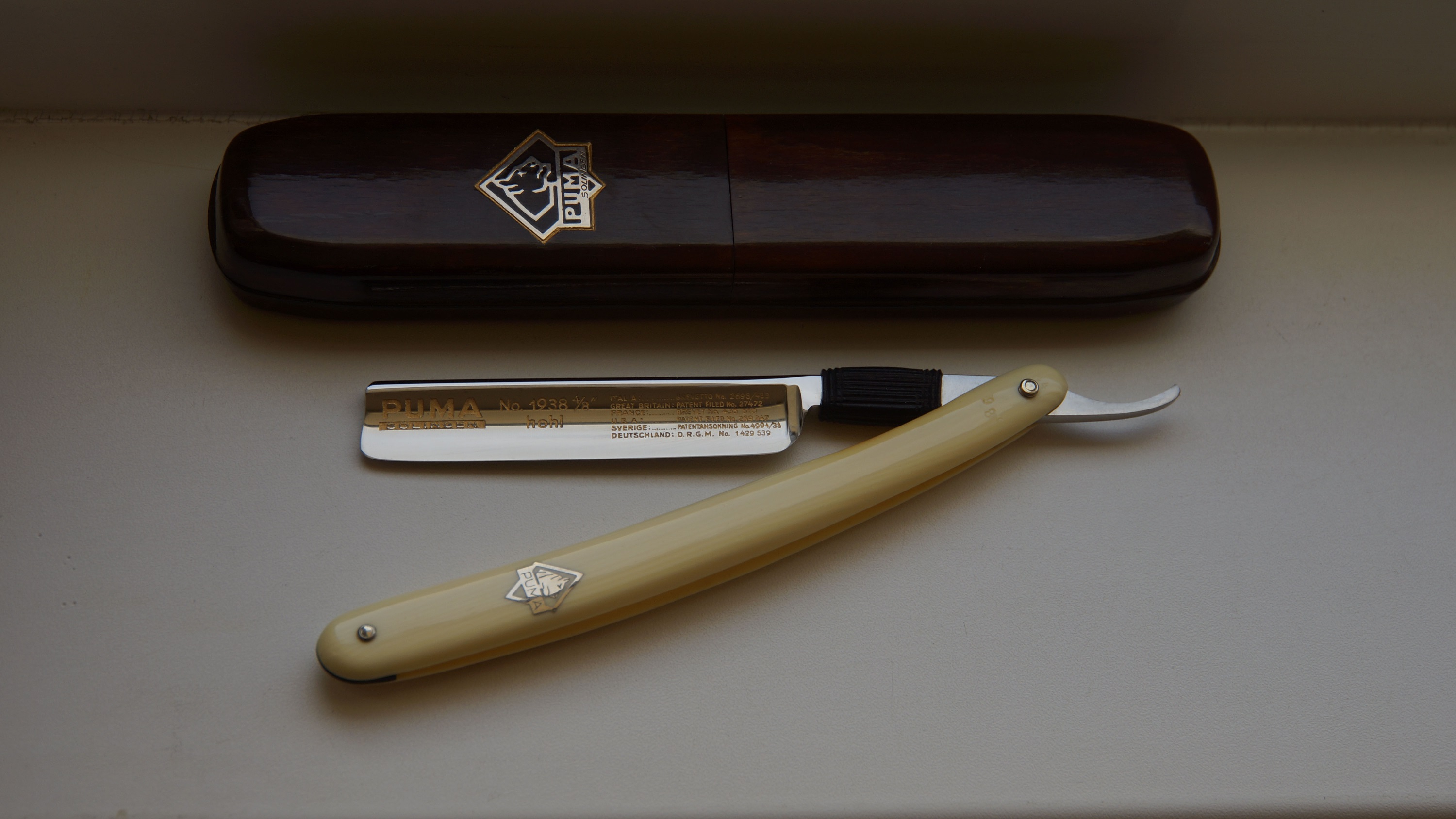 Производитель: Lauterjung & Sohn, Puma-Stahlwaren Германия, г. Золинген Ручка из целлулоида, с металлическим логотипом. Состояние на фото. Бритва заточена и готова к бритью. В комплекте также родной футляр. ПРОДАНО 10) Puma No. 1938, 5/8 Show
