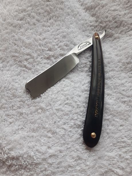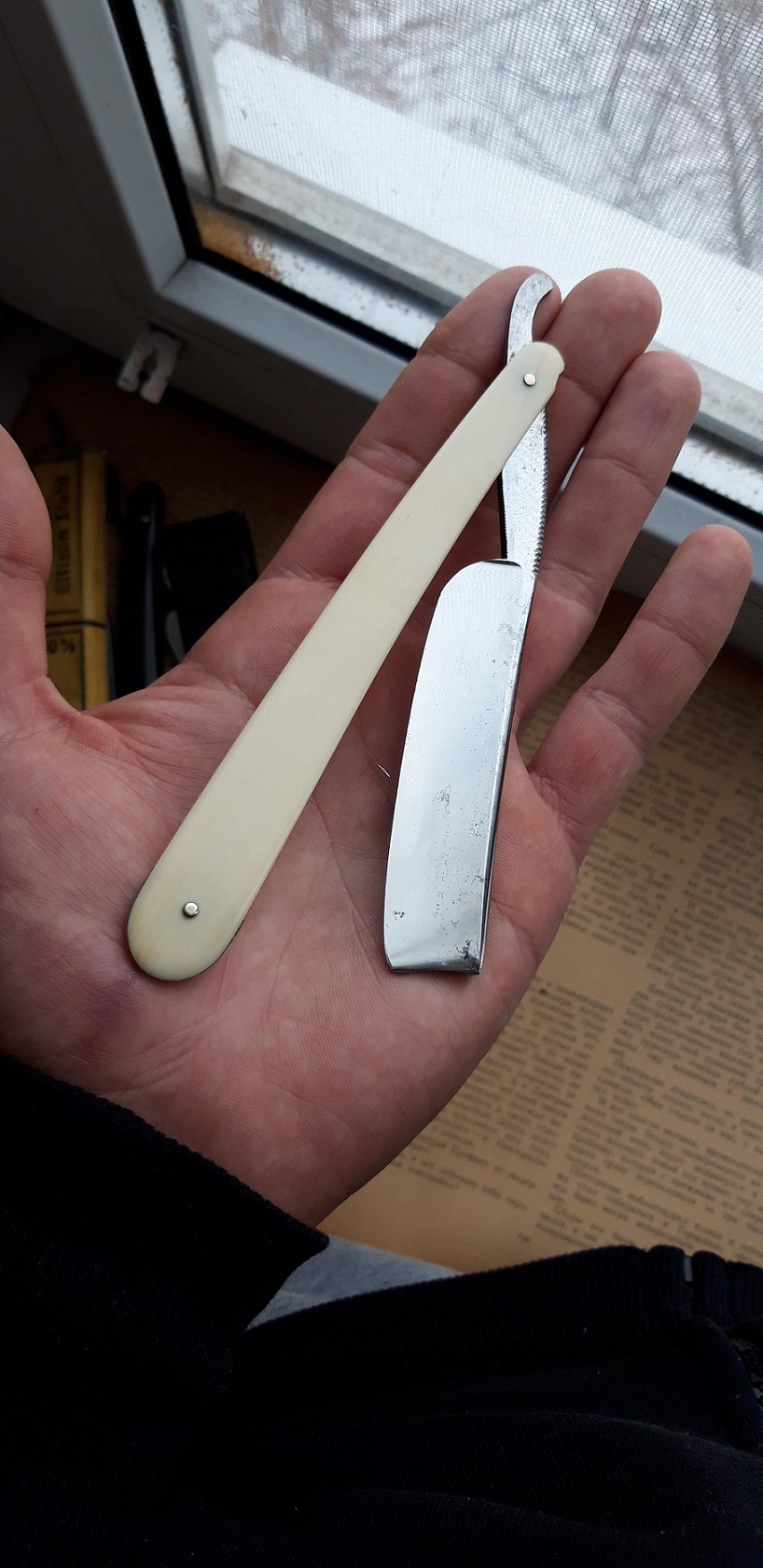 Красивая, Улыбчатая бритва. Имеется патина и небольшие продольные царапины (Не Я). Ручка слон. Клинышек - олово. Бритва имеет заводской гринд и блеск. Камней не видела. Геометрия на высшем уровне! Достойный экспонат. Не заточена. Фраза "Под восстановление", почему-то, язык не поворачивается сказать. Продана.
