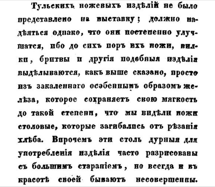 1845 год. попали в обозрение главнейших отраслей мануфактурной промышленности России с критикой на очень низкое качество выпускаемой продукции: златоустовские изделия крошатся, что происходит от слишком сухой закалки стали, булатные ножи резались обычным столовым ножом, бритвы искрошились.