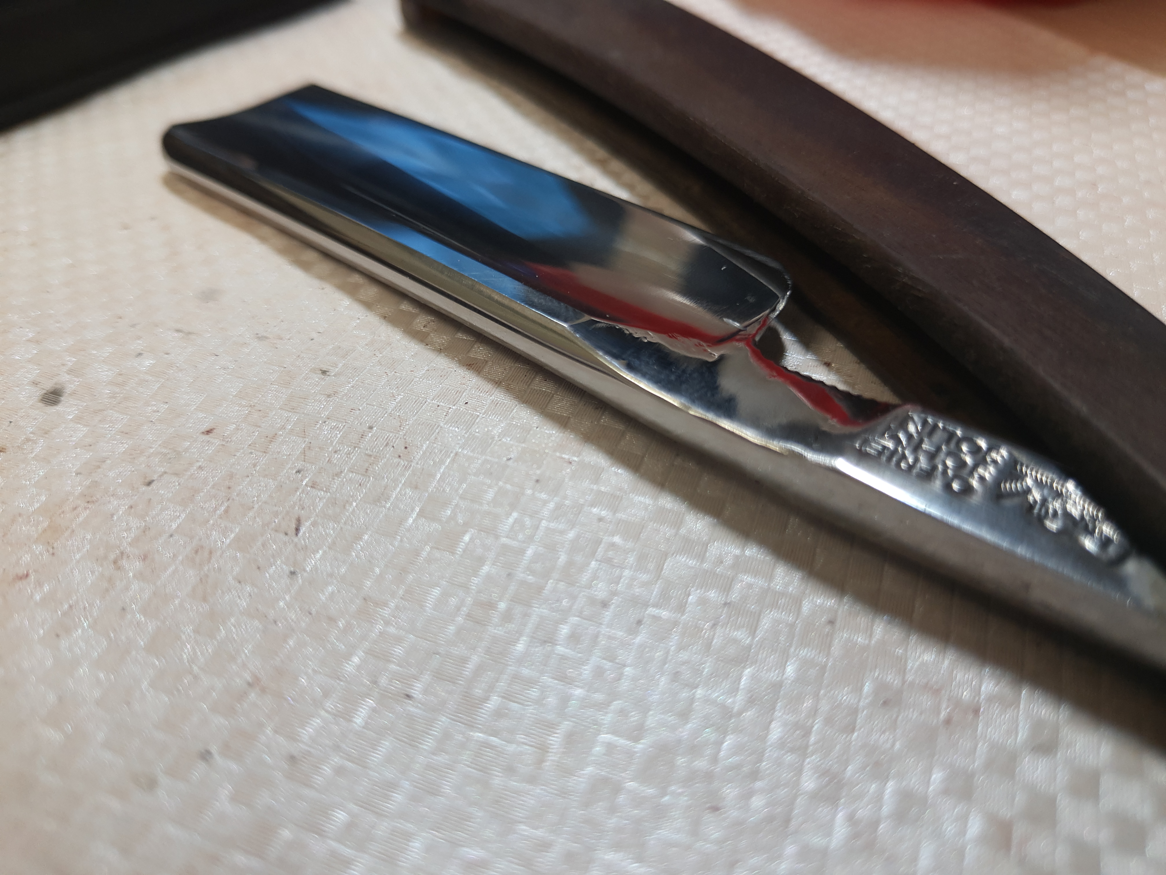 У японцев например это очень распространенная процедура, у меня даже валяется парочка таких, но искать лень для пофоткать. Если посмотреть бритву на твоем фото. То видно что у пятки ширина проточки велика есть. А у носика весьма узко. Значит бритва была винтом. И если там второй заков был сделан мелко то его пришлось бы весь стачивать чтобы заточить. А это крайне долго, пошла бы уточка к носу сильная и т.д. Японцы не цеременятся - они например пятку срезают ОЧЕНЬ часто (шоб було) мм на 5-10 И такие пятна выковыривают тоже. Более того для их бритв это по сути стандартная выточка. Сам такую делал (сам сем штюк скушаль). Это четкое ограничение базы заточки. Японок без этого и заточить то трудно. На фото обвел ямку что сам делал и красными линиями ограничение базы заточки. Ну и пальчик большой в выборку ложится удобно Кстати я как то давно уже писал - это вообще почти стандартная проблема на новых немцах. Это связано что они точат на кругу. И на обушке остается непроточенным участок мм 5 в районе пятки. И при первой переточки новой немки приходится этот участок сносить/протачивать.