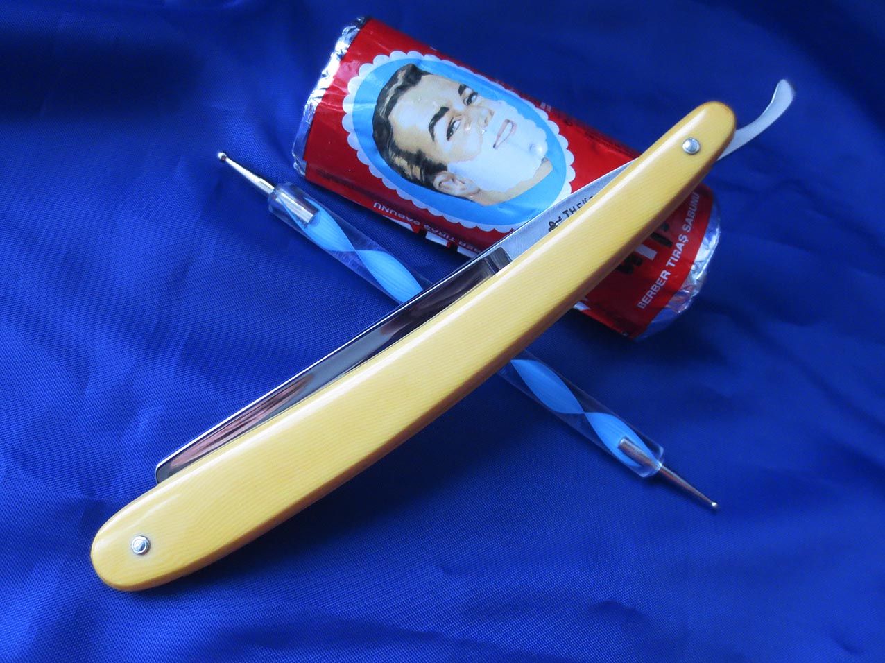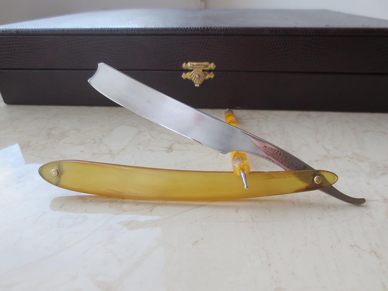Старинная английская бритва Muntz&Comp Warranted razors Sheffield. Ширина клинка - 9/16 дюйма, качественная углеродистая сталь, родная оправа из медового рога, заклёпки - латунь. Установлены внутренние дополнительные шайбы для большей сохранности и удобства, родная проставка из олова сохранена. Инструмент протестирован лично, бреет чётко, бритва довольно маневренная и поэтому подойдёт не только для основного бритья, но и для обрамления усов и бороды... Также в наличии ремни для правки из натуральной кожи растительного дубления и при покупке с бритвой доставка по РФ, хоть на Таймыр за мой счёт. Цена - 3550 рублей.