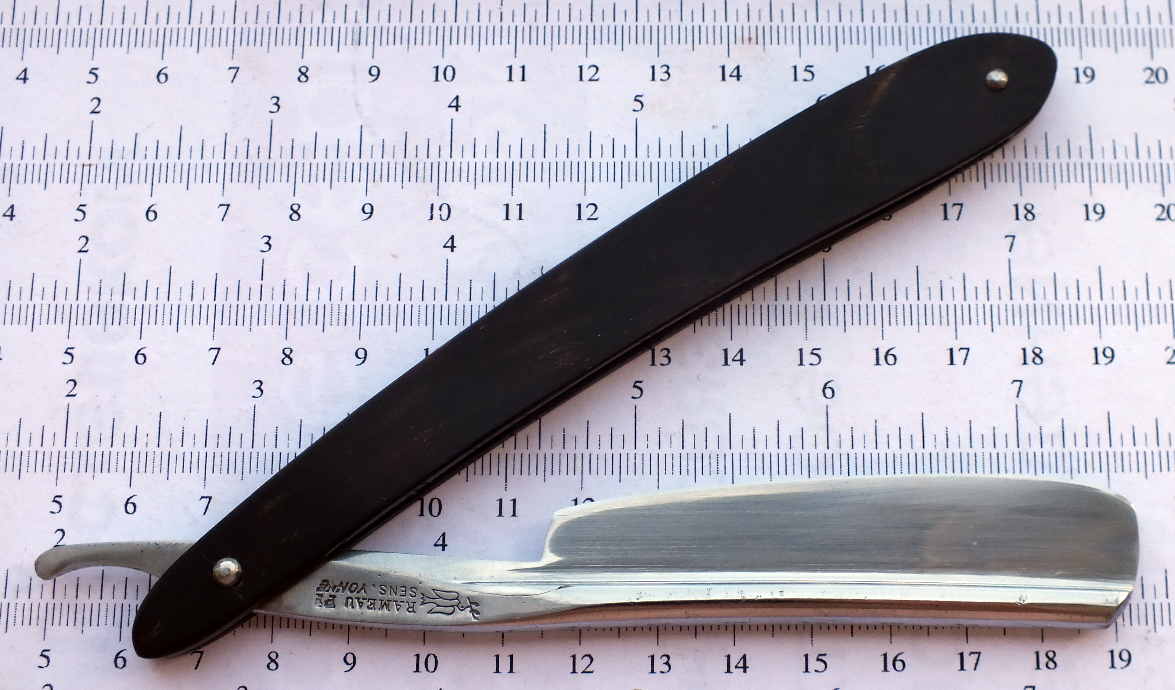 Состояние целки. Точил впервые. Кромка 0,15 мм. Есть следы времени. На обушке и полотне единичные неглубокие точки. 6/8 ложный фреймбэк. Углеродистая сталь, рог, кость. Бритва заточена и готова к бритью. Продано. Spoiler Show
