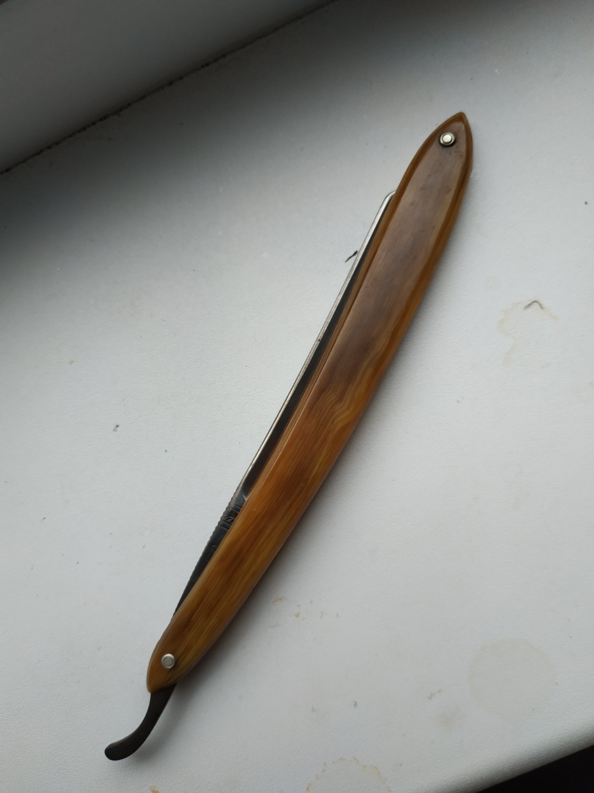 W. Wanke OberleutensdorfУ меня есть бритва похожих форм точно с таким же узорчиком. Виг, когда он еще тут был, писал что это характерно именно немецким бритвам начала 20 века Полотна не видно, что там вообще. Но по моему оно узкое. Коллекц. ценности нет, но может можно восстановить и бриться