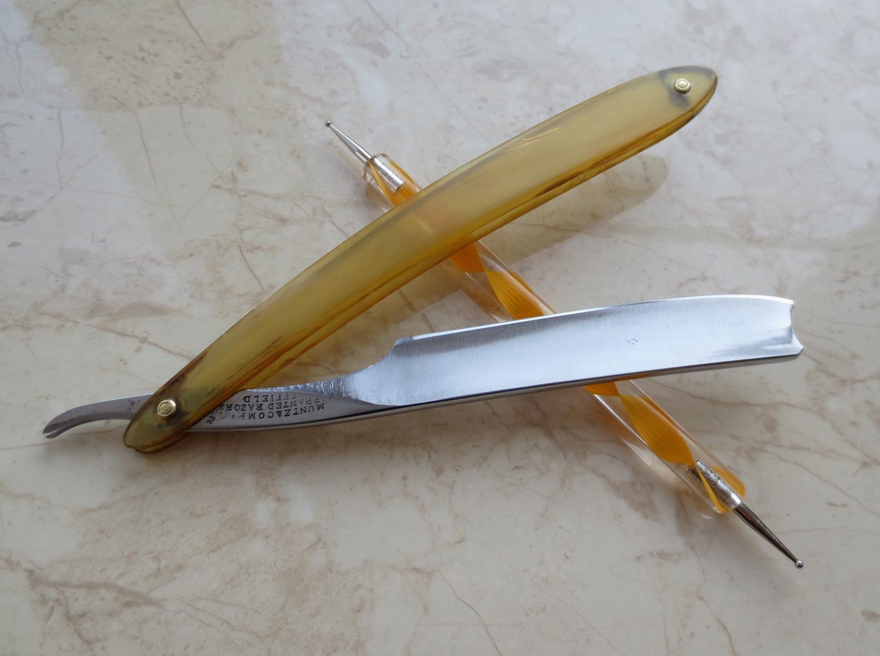 Старинная английская бритва Muntz&Comp Warranted razors Sheffield. Ширина клинка - 9/16 дюйма, качественная углеродистая сталь, родная оправа из медового рога, заклёпки - латунь. Установлены внутренние дополнительные шайбы для большей сохранности и удобства, родная проставка из олова сохранена. Инструмент протестирован лично, бреет чётко, бритва довольно маневренная и поэтому подойдёт не только для основного бритья, но и для обрамления усов и бороды... Также в наличии ремни для правки из натуральной кожи растительного дубления и при покупке с бритвой доставка по РФ, хоть на Таймыр за мой счёт. Цена - 3550 рублей.