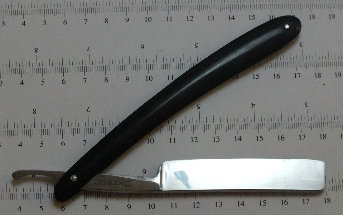 Состояние целки. Точил впервые. Кромка 0,15 мм. Есть следы времени. На обушке и полотне единичные неглубокие точки. 6/8 ложный фреймбэк. Углеродистая сталь, рог, кость. Бритва заточена и готова к бритью. Продано. Spoiler Show