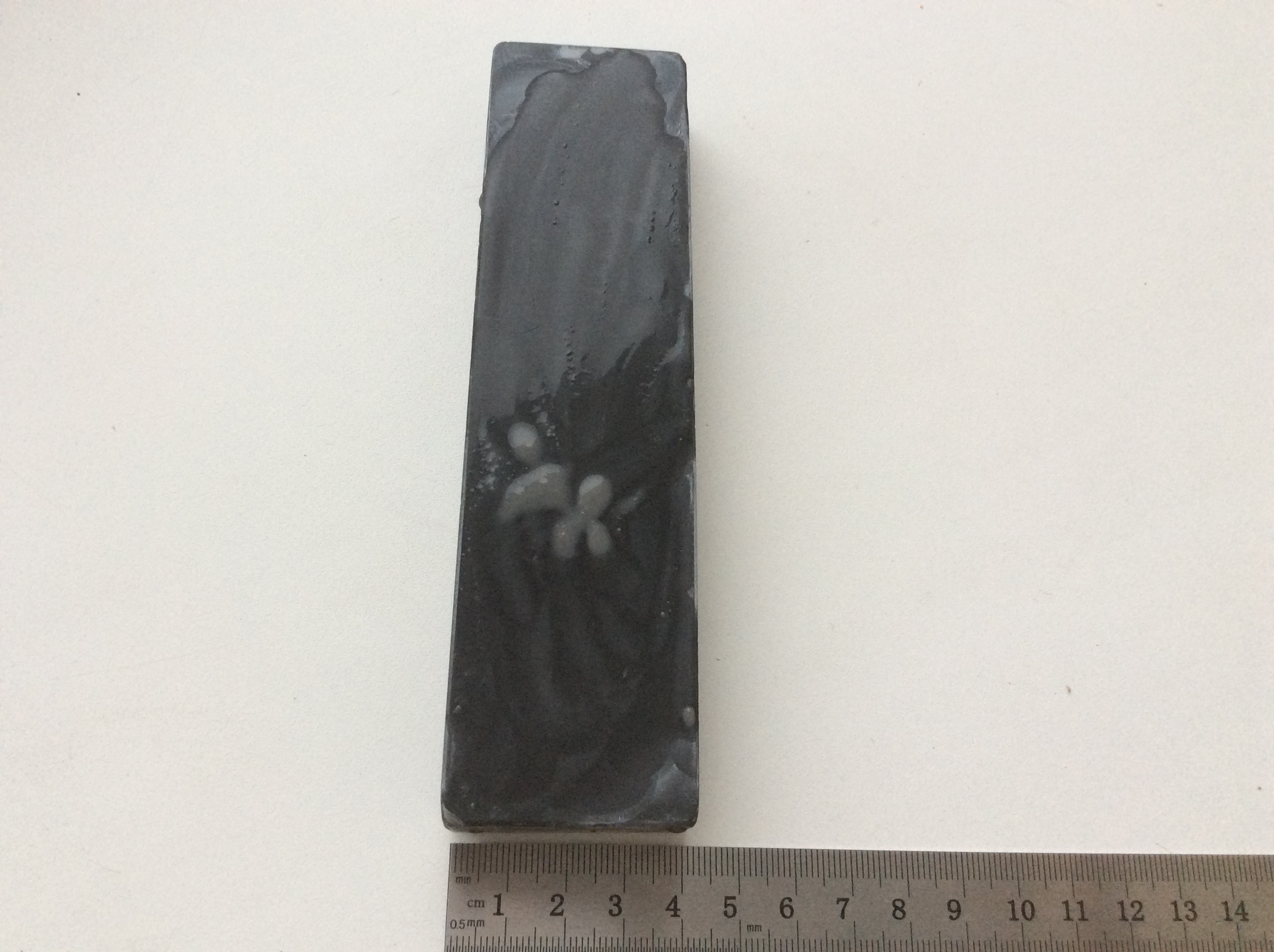 Помогите определить каменьПриветствую форумчане. Лежит у меня тут лет 15 невостребованный камень. Забрал его у тестя, которому он достался от деда. Камень тяжёлый, очень мягкий, но вместе с тем и очень плотный. Подскажите, это советский или ещё какой? Суспензию наводил Цусимой. Влажная суспензия серая, сухая белая. Сам камень цвет при намокании особо не меняет, постоянно чёрно-смоляного цвета. Толщина после выравнивания 20 мм., а была где-то 25 мм.