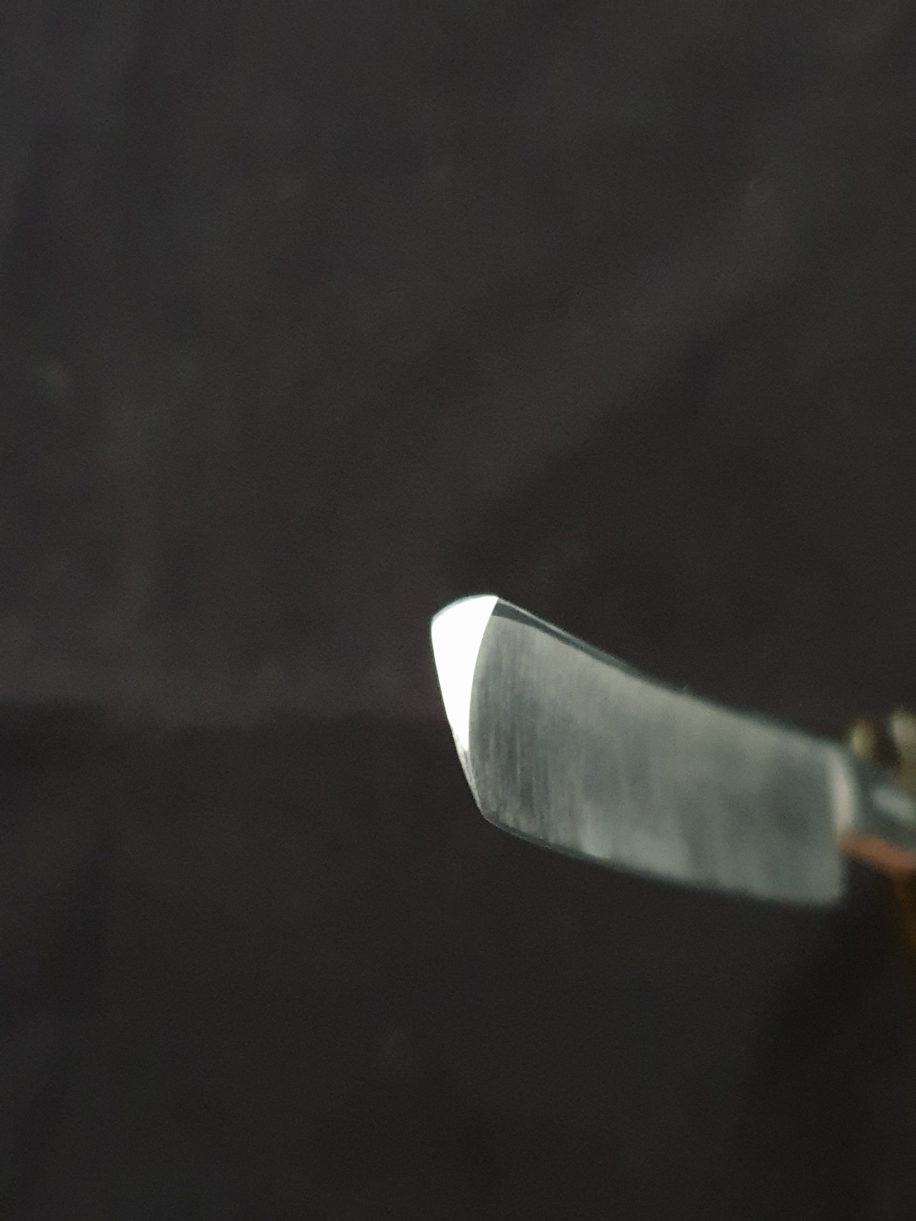 Продаётся от S&T67. Винтажный французский бесхвостый клин, под восстановление. От клейма остались полунамеки на пару букв. Ширина клинка 16мм. Ручка из рога, в весьма хорошем сохране, крепкая, пины - железо, с внешними шайбами типа "бычий глаз". Мелкая насечка на эрле с обеих сторон. Все родное, бритва не разбиралась, клинок паркуется в ручку по центру, без перекосов.