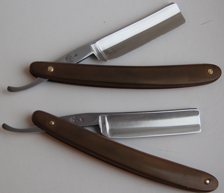 Обе бритвы в прекрасном состоянии. Разобрал, немного освежил металл и снова собрал, сохранив родные пины и добавив внутренние шайбы.Не заметил следов активного пользования:обушки не стерты и не имеют видимых следов от заточных камней.Идеальная геометрия на обеих бритвах:кромочки равномерна по всей длине и еле заметны.Хотелось бы обратить внимание , помимо качественной стали, на форму клинков, которая не только красиво смотрится, но и такая бритва будет очень удобна в обращении, прежде всего новичку, но и не только. РазмерЮ ширина полотна и умеренный вес также будут идеальным вариантом для обучения.В общем и целом бритвы достойные, за относительно небольшие средства. Так как на обной из бритв был небольшой скол(отсюда и ширина полотна-17 мм),то она будет стоить 4800 р , с доставкой. ПРОДАН