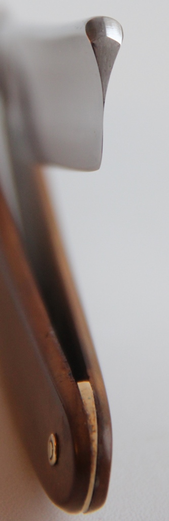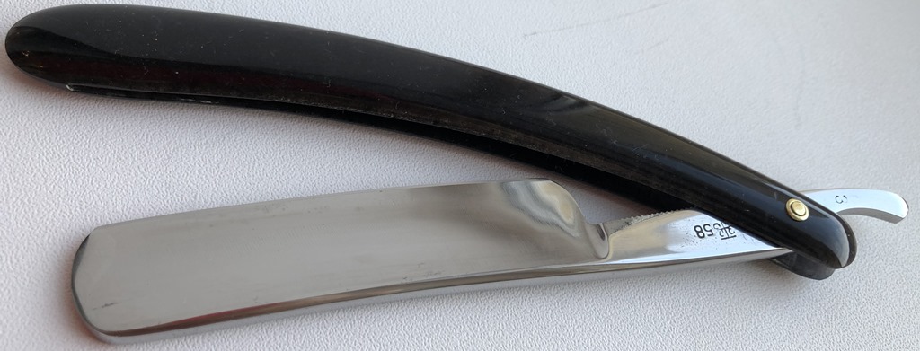 Бритва в очень хорошем состоянии. Разобрал, немного освежил металл и снова собрал, поменяв пины на более надёжные втулки, со внутренними шайбами.Сталь и кромка чистые, без видимых дефектов. Оправа из натурально рога также в отличном состоянии для своих лет. Бритва мощная, тяжёлая, но в тоже время имеет по-французски элегантные очертания.Красивая и практичная бритва, способная выдавать качественное и мягкое бритьё. Заточена и готова к пользованию.