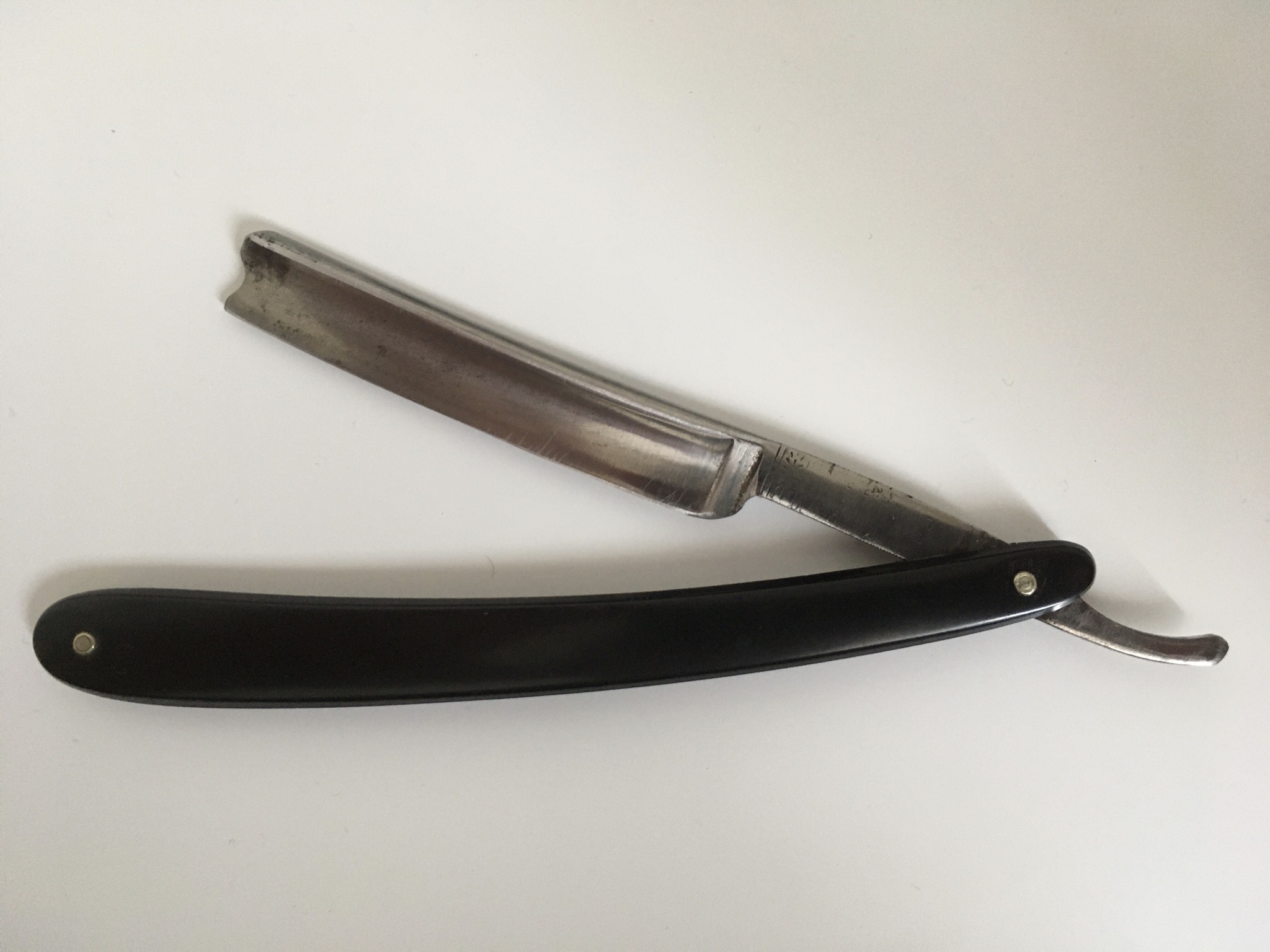 С опасными бритвами я не так давно. Недавно решил взять что-нибудь на блошином рынке на поиграться для восстановления и заточки. Нашел бритву достаточно сточенную уже, но вроде живую. Немного привел в чувство. Теперь стало интересно можно ли примерно определить период выпуска. Коробка скорее всето не родная - зеленая, Solingen и надпись Durex двойная. На самой бритве ничего кроме Silberstahl Solingen нет. С подводов убрана вся коррозия, заточена для бритья. Посмотрим как будет держать заточку, так как были предположения, что давно над ней поработали очень грубо. Когда отчистил пастой стали заметны очень грубые риски. Насколько понимаю, без клейма говорить о производителе бесполезно. Может хоть период времени... Ручка уж больно хлипкая - тонкий целлулоид с просветкой в нескольких местах "под янтарь". Бритва шелестит почище моей новой Дова прима.