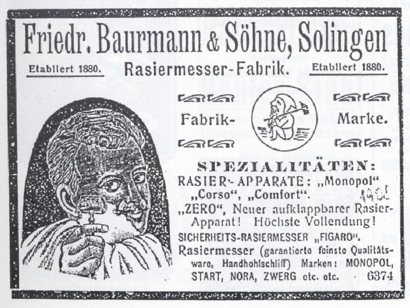 Friedr. Baurmann & Söhne, Solingen in 1914, 1920, 1922, 1925 and 1932, Beethovenstrasse 76 in 1939, Sandstrasse 27 in 1983. Торговые марки : 'Alecto', 'Ambidexter', 'Aviator', 'Baurmann', 'Carbonese', 'Clanor', 'Comfort', 'Corso', 'Ducado', 'Figaro', 'Karbono', 'Marbest', 'Monopol', 'Nora', 'Norma', 'Orchid', 'Peter Hahn', 'Raola', 'Safacto', 'Sunrise', 'Start', 'Yilin', 'Zerbo', 'Zero', Zwerg.